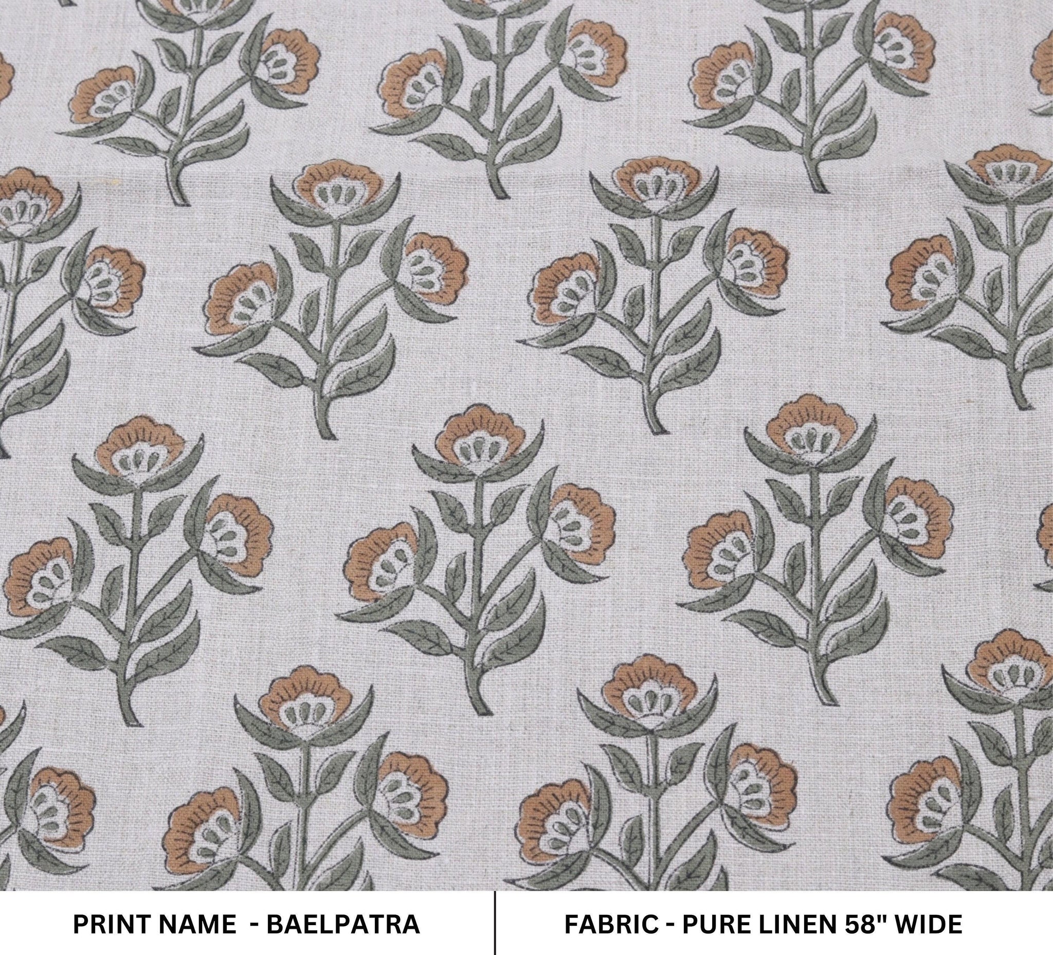 Elevate your home décor with the BAELPATRA Handcrafted Pure Linen Fabric. Featuring elegant bronze and gray floral motifs, this fabric is meticulously hand block printed by skilled Indian artisans using traditional wooden blocks. Made from premium 100% pure linen, it offers a soft, breathable, and durable texture—ideal for cushions, pillowcases, curtains, upholstery and other decorative home projects.