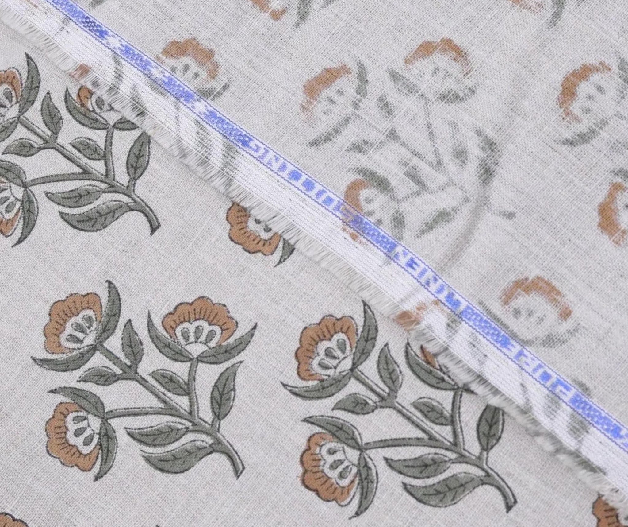Indian Block Printed Premium Pure Linen Cushion Fabric in Bronze and Gray Floral for Curtains & Upholstery Drapery - BAELPATRA
