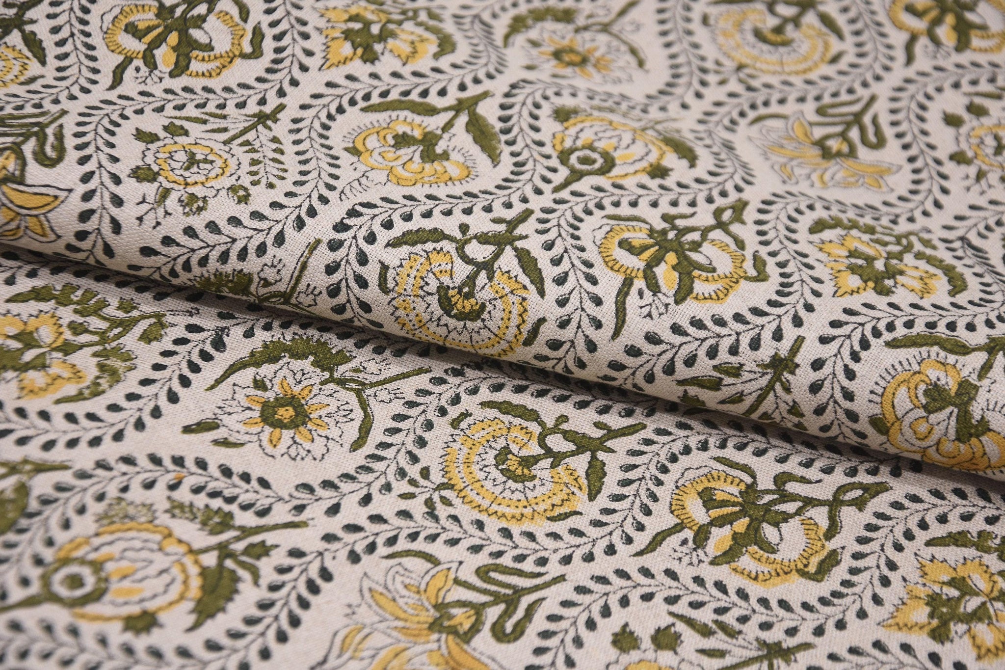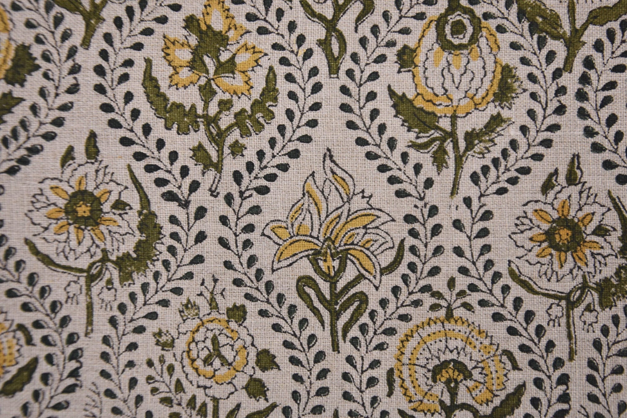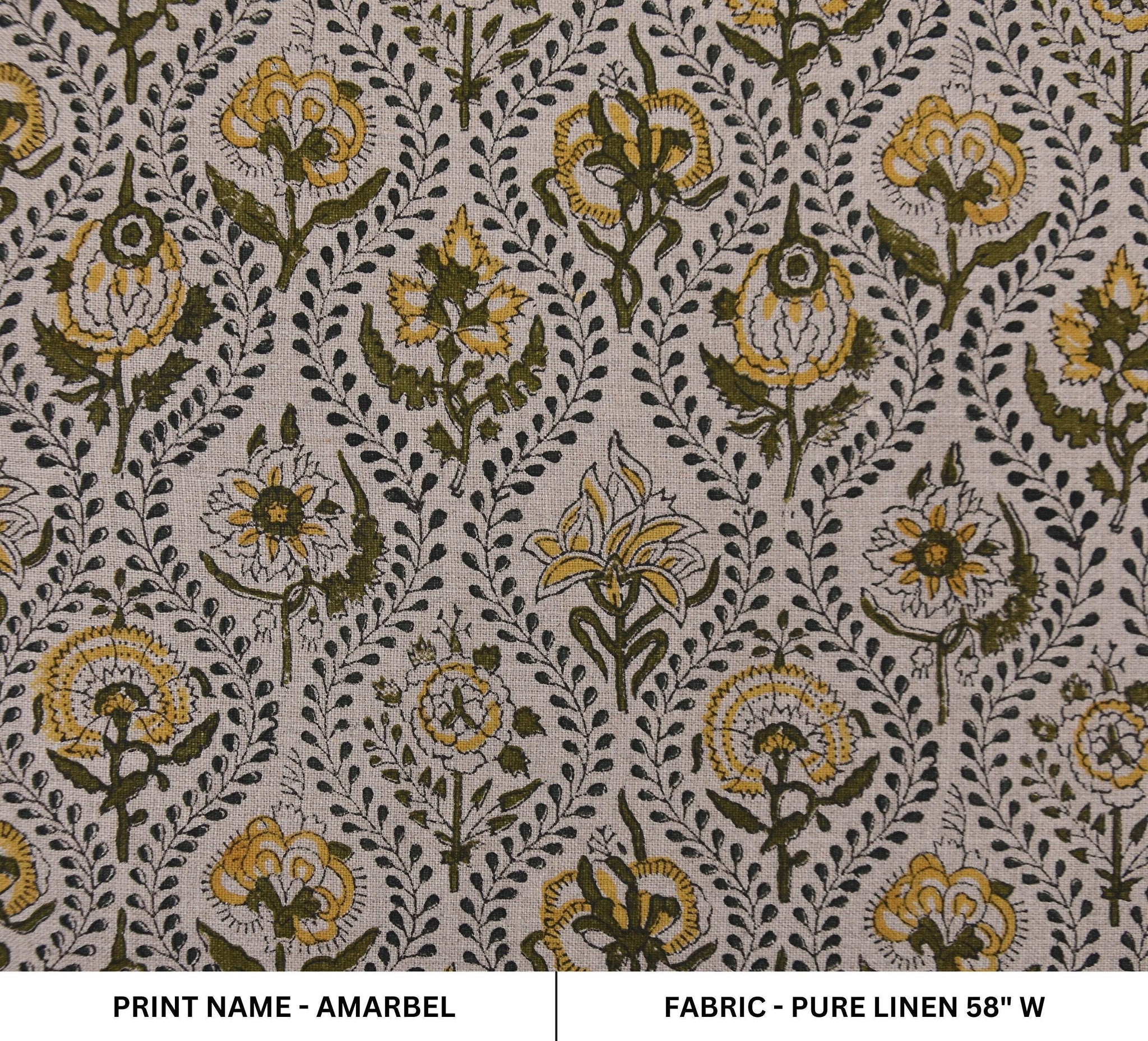 Hand Block Printed AMARBEL 58" Wide Pure Linen Fabric in Green & Mustard Big Floral for Lampshades