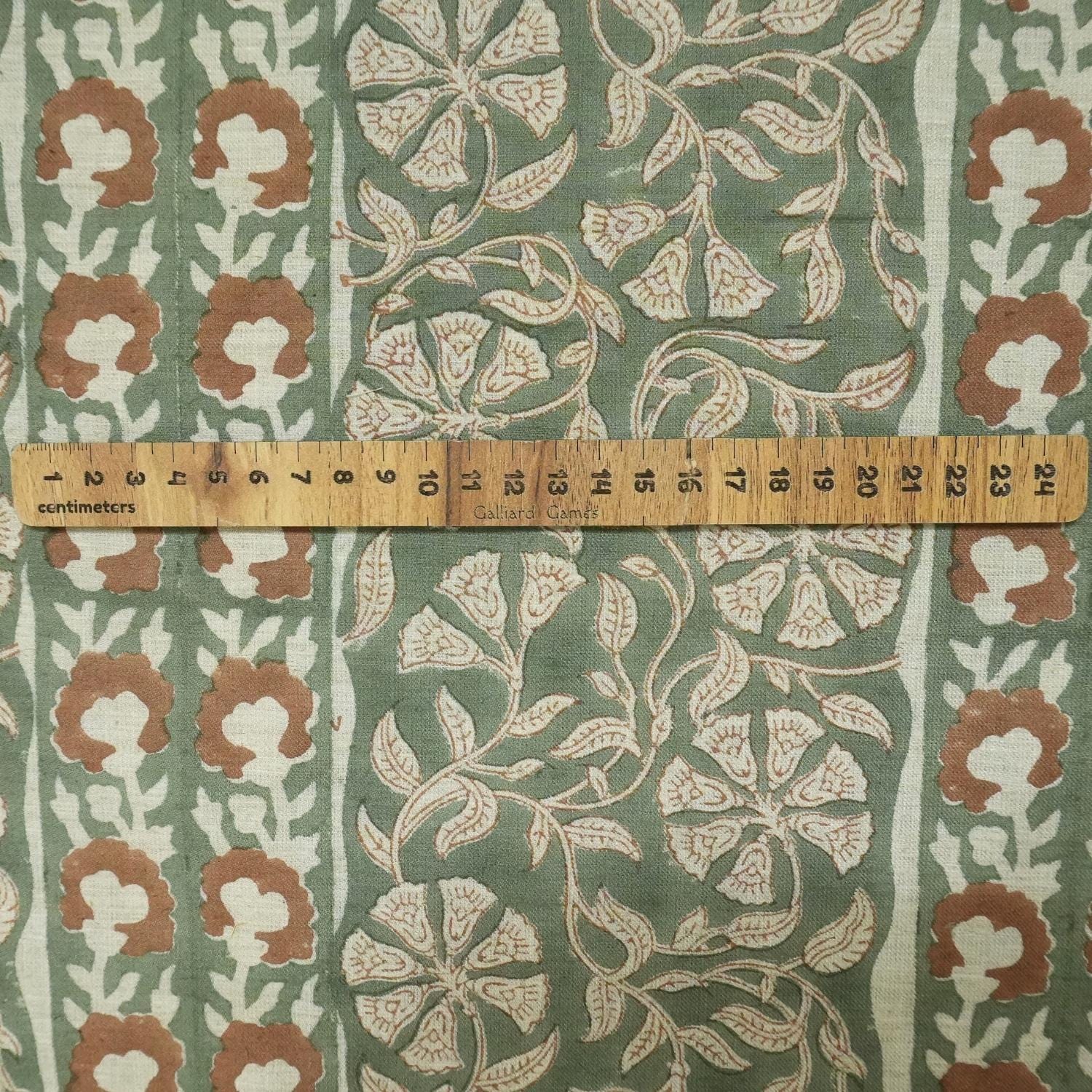 Indian Block Printed Floral Pure Linen Natural Fabric in Brown and Green for Curtains Boho Decor – Rudraksh Border