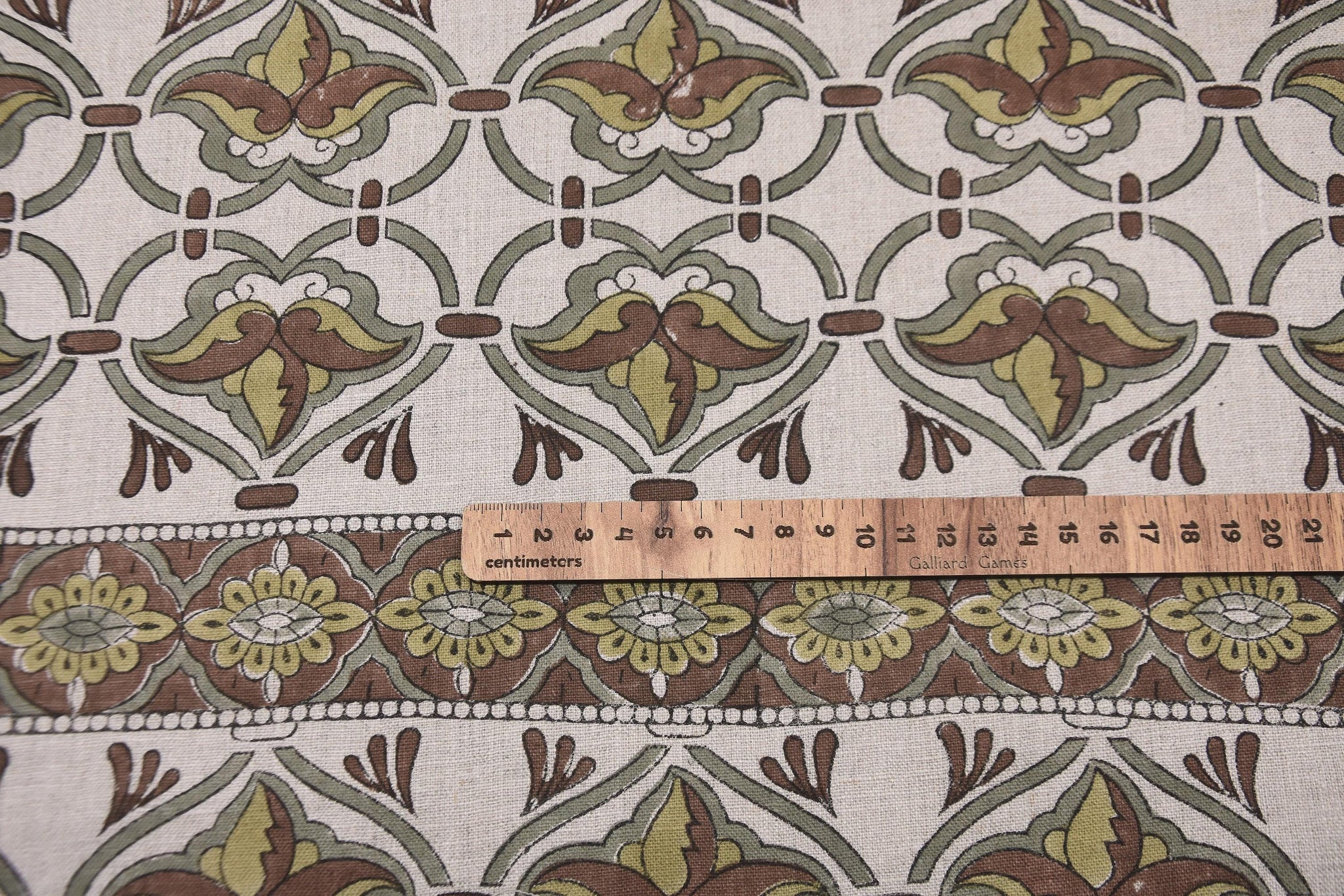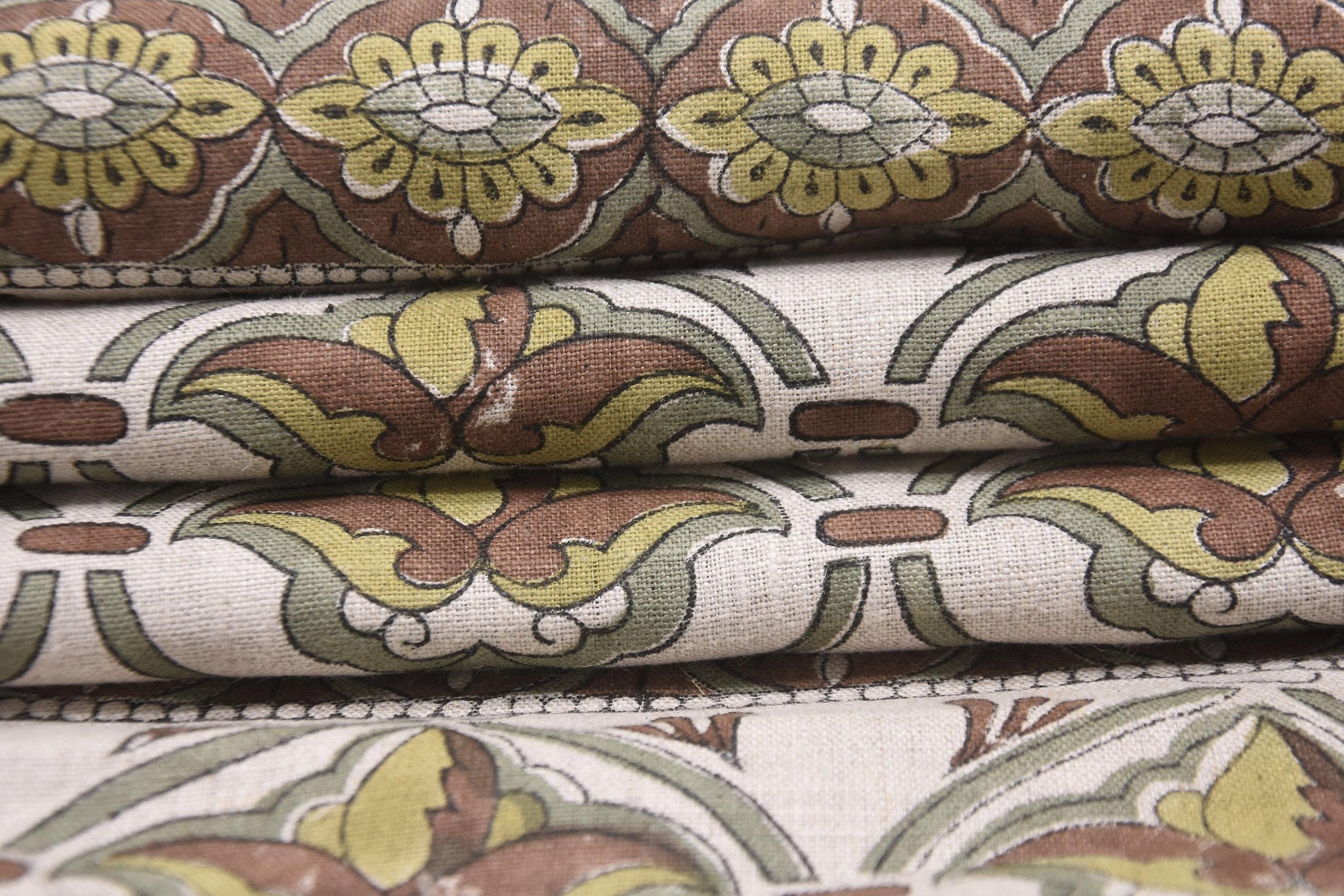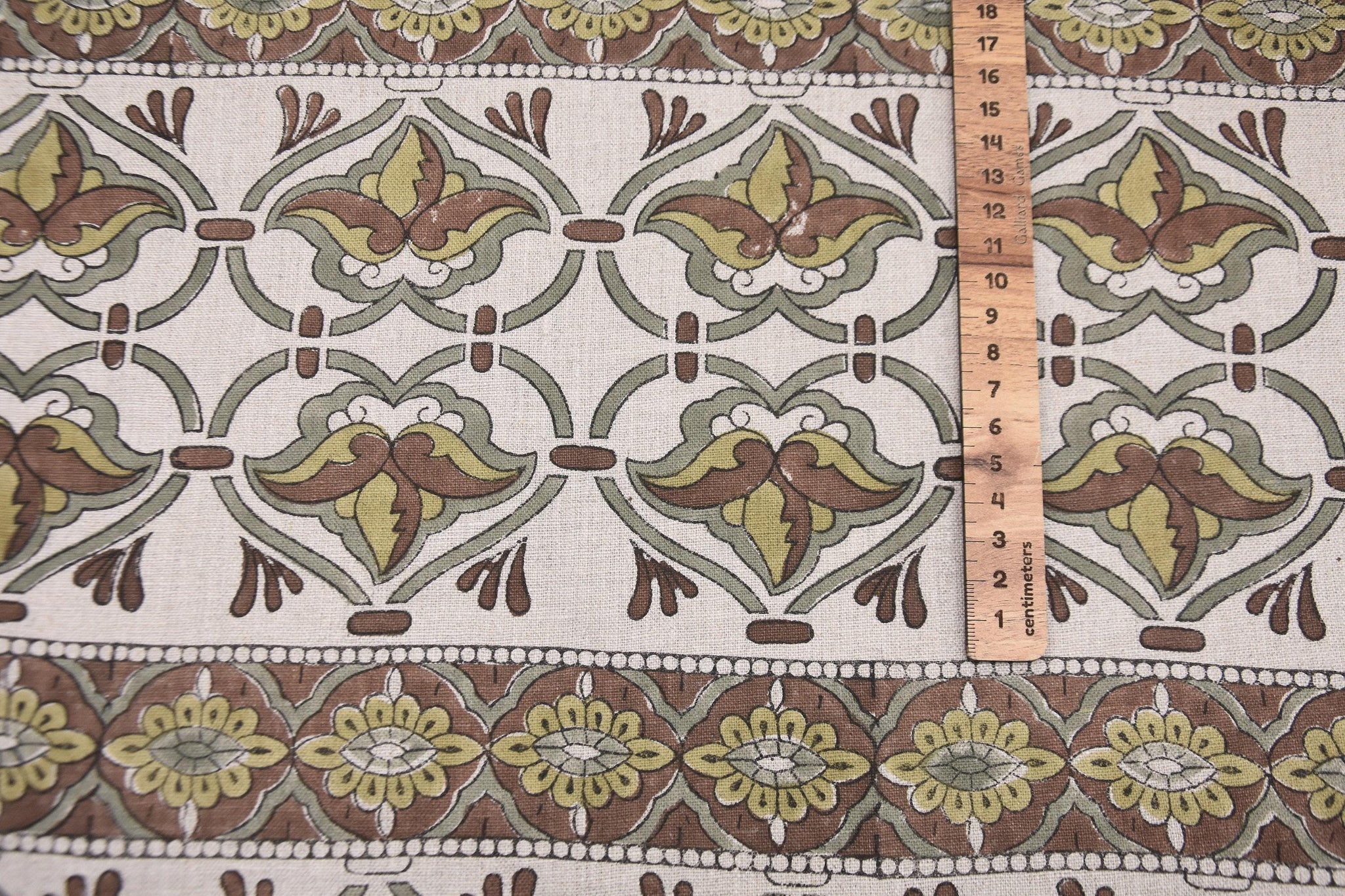 Hand Block Printed 58" Wide Brown and Sage Green Floral 100% Pure Linen Fabric for Drapery & Pillows - HRIDYAVAN BORDER