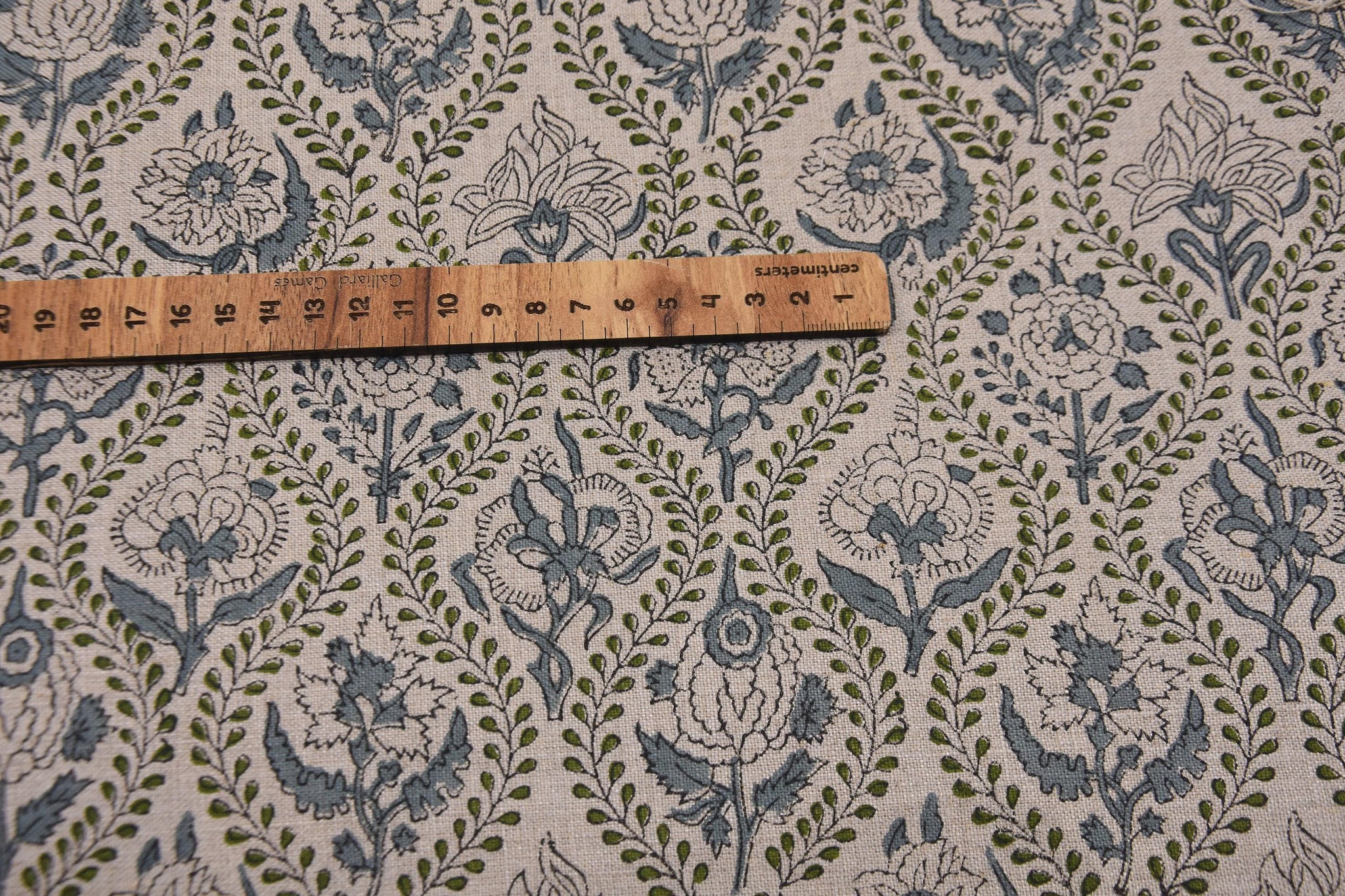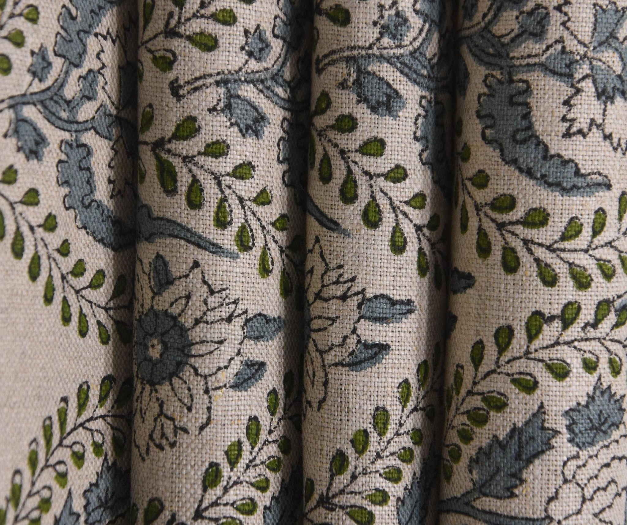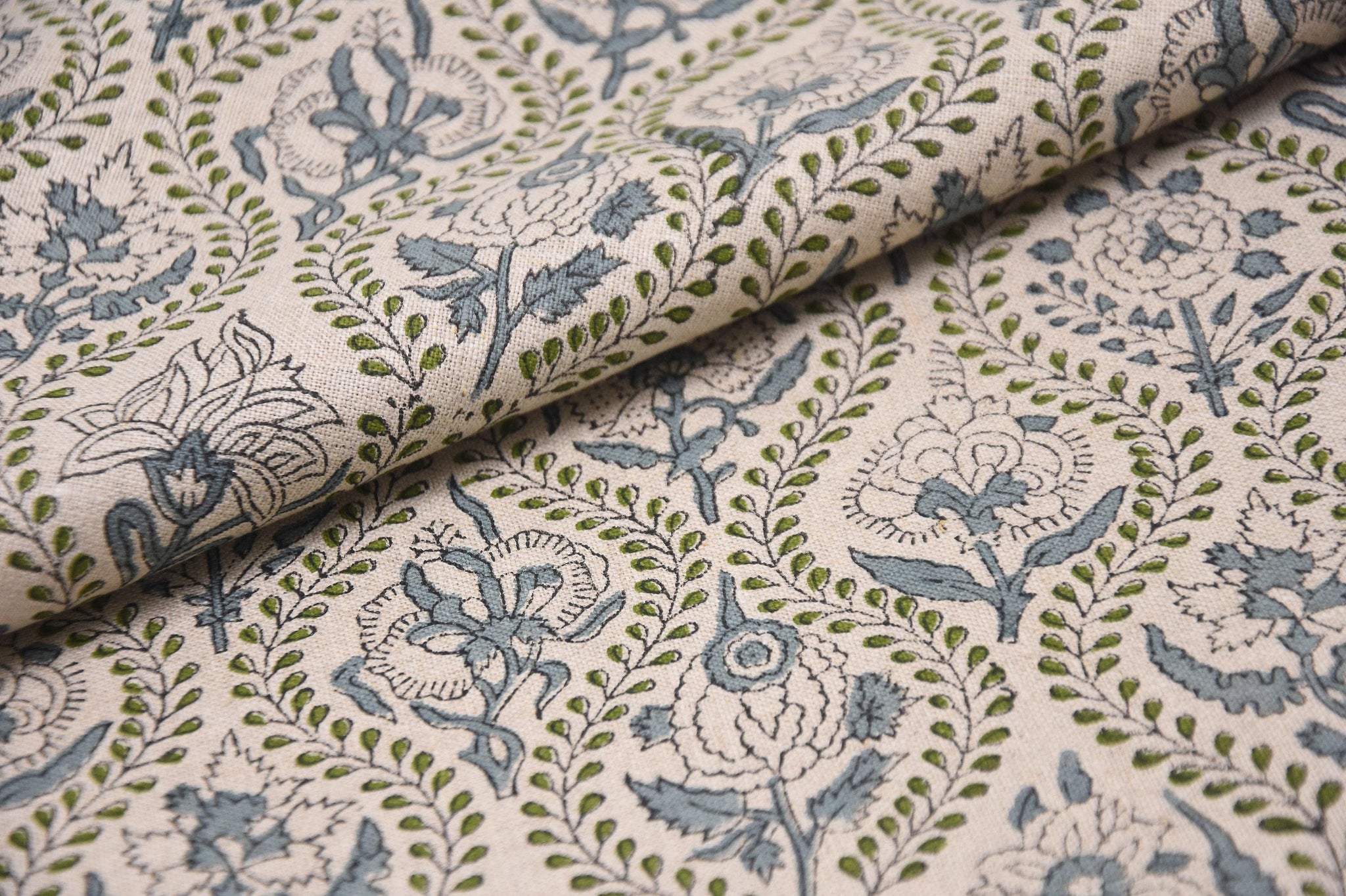 Handcrafted Gray and Green Floral Block Printed 100% Pure Linen Fabric for Farmhouse Decor – Amarbel