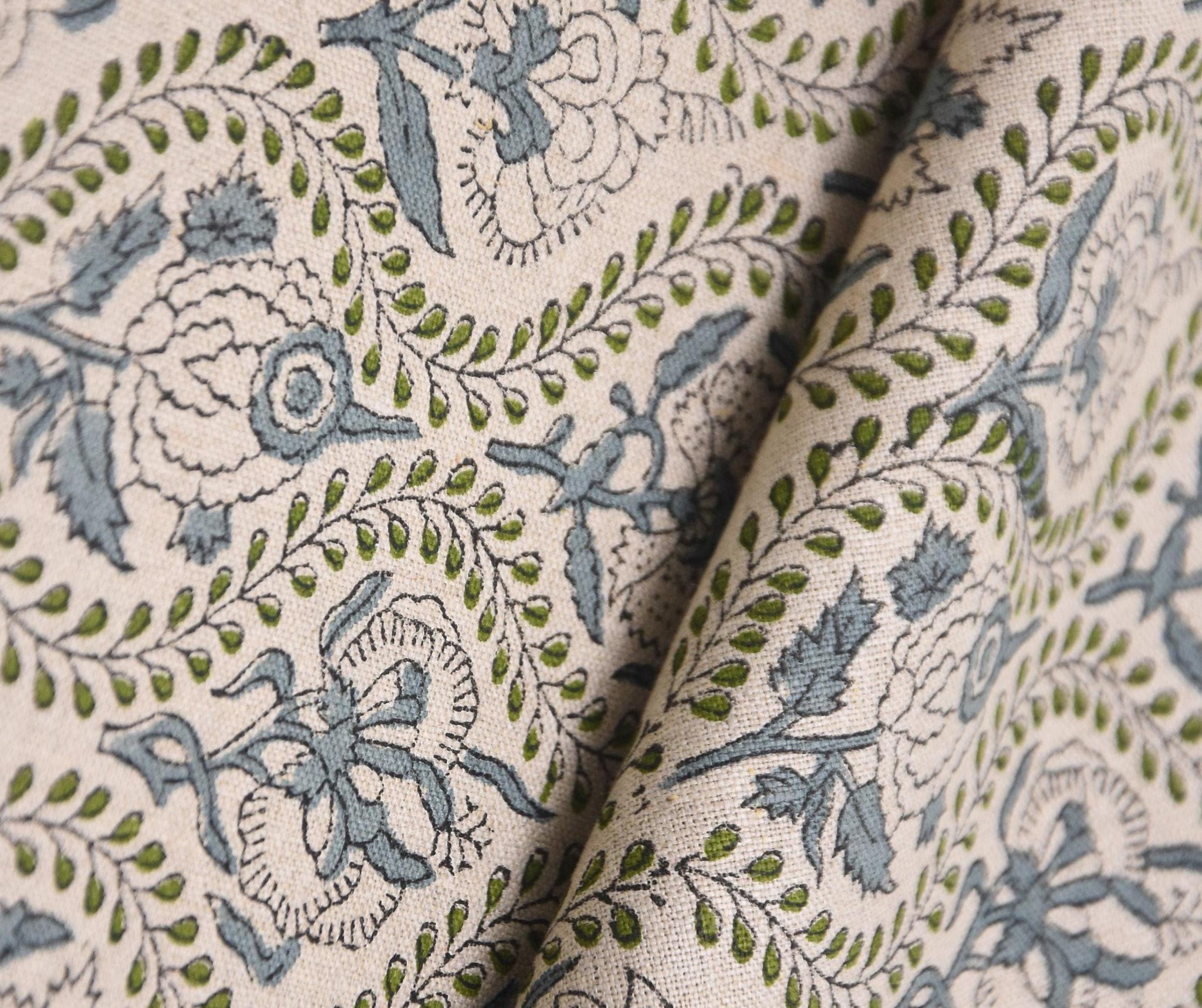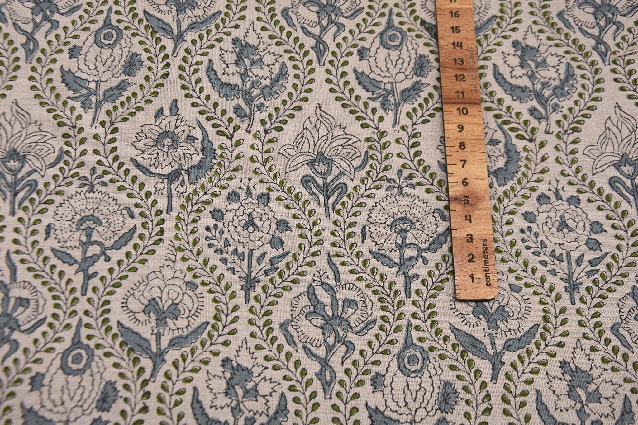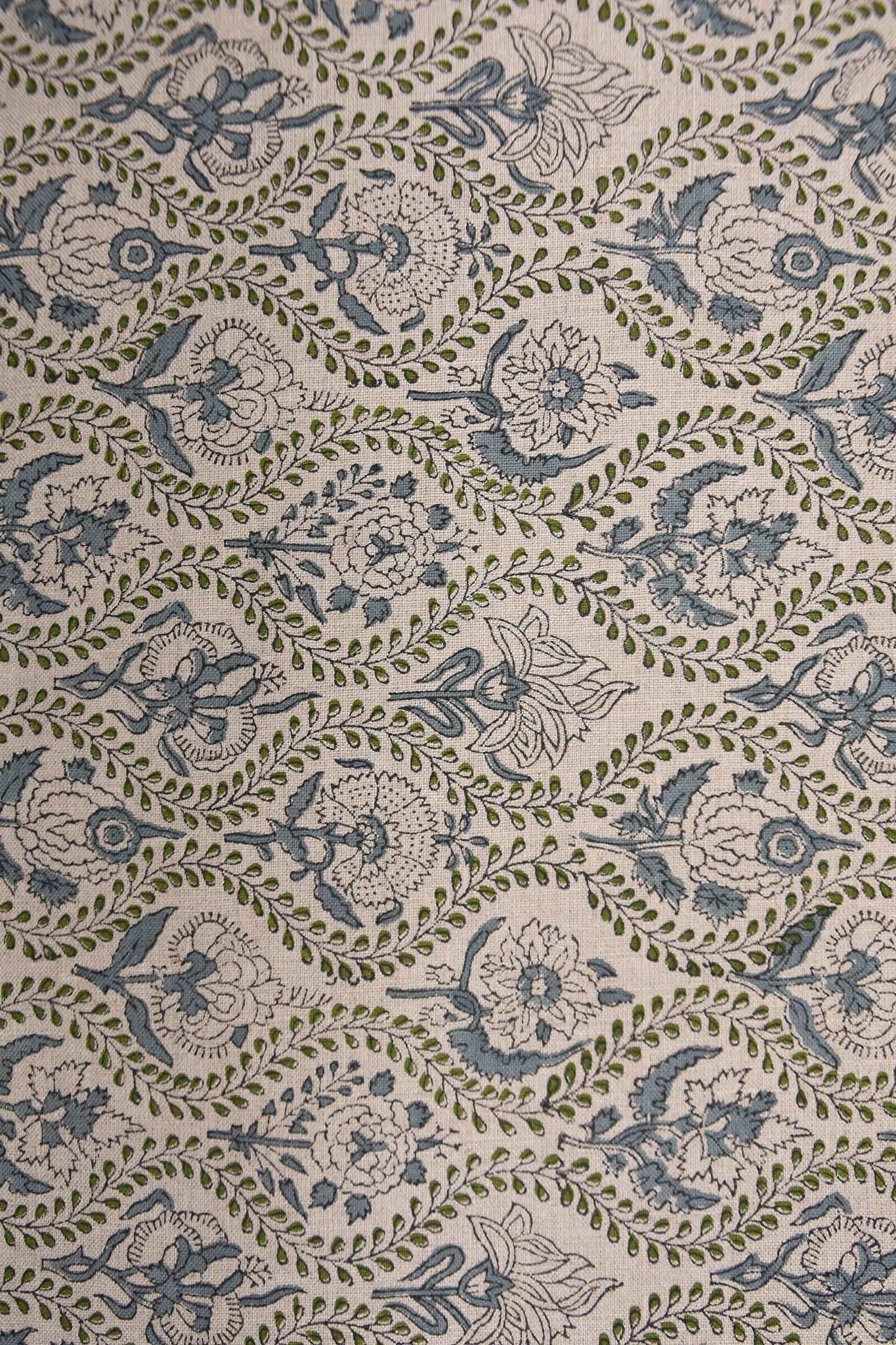 Handcrafted Gray and Green Floral Block Printed 100% Pure Linen Fabric for Farmhouse Decor – Amarbel