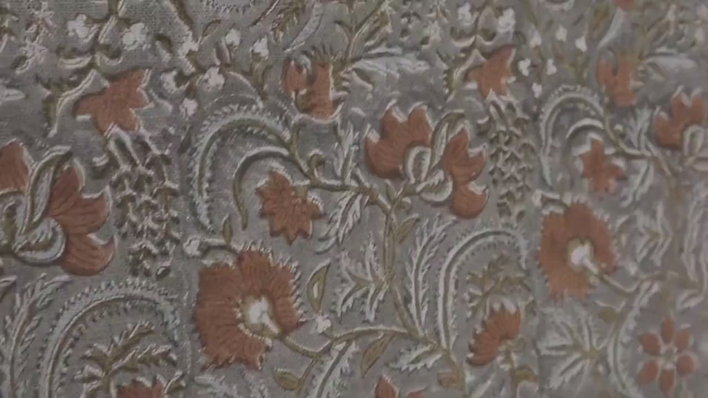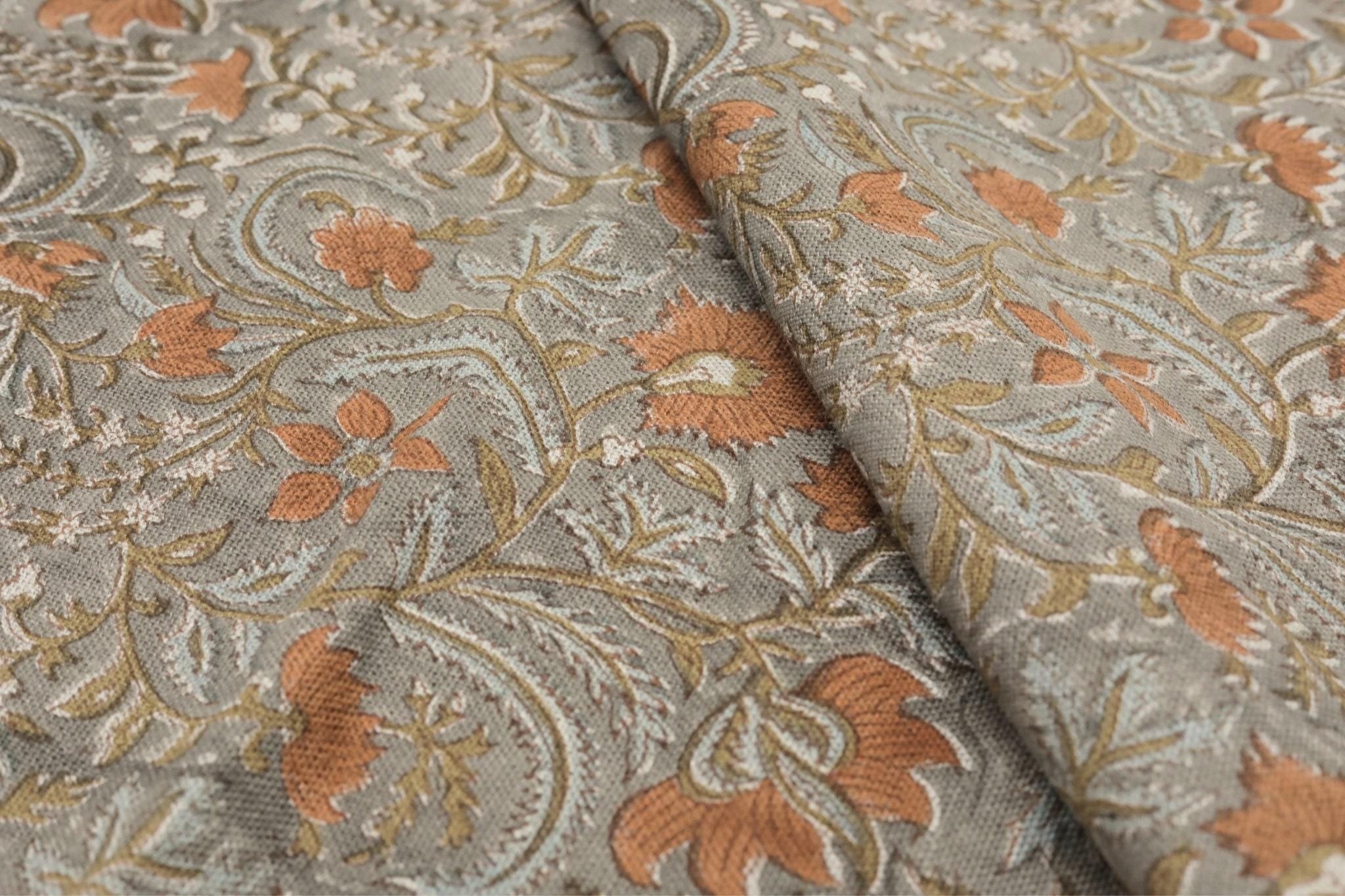 Indian Hand Stamped Block Printed Thick Linen Pure Fabric in Bronze and Gray Floral for Living Room Decor – Kundanvan
