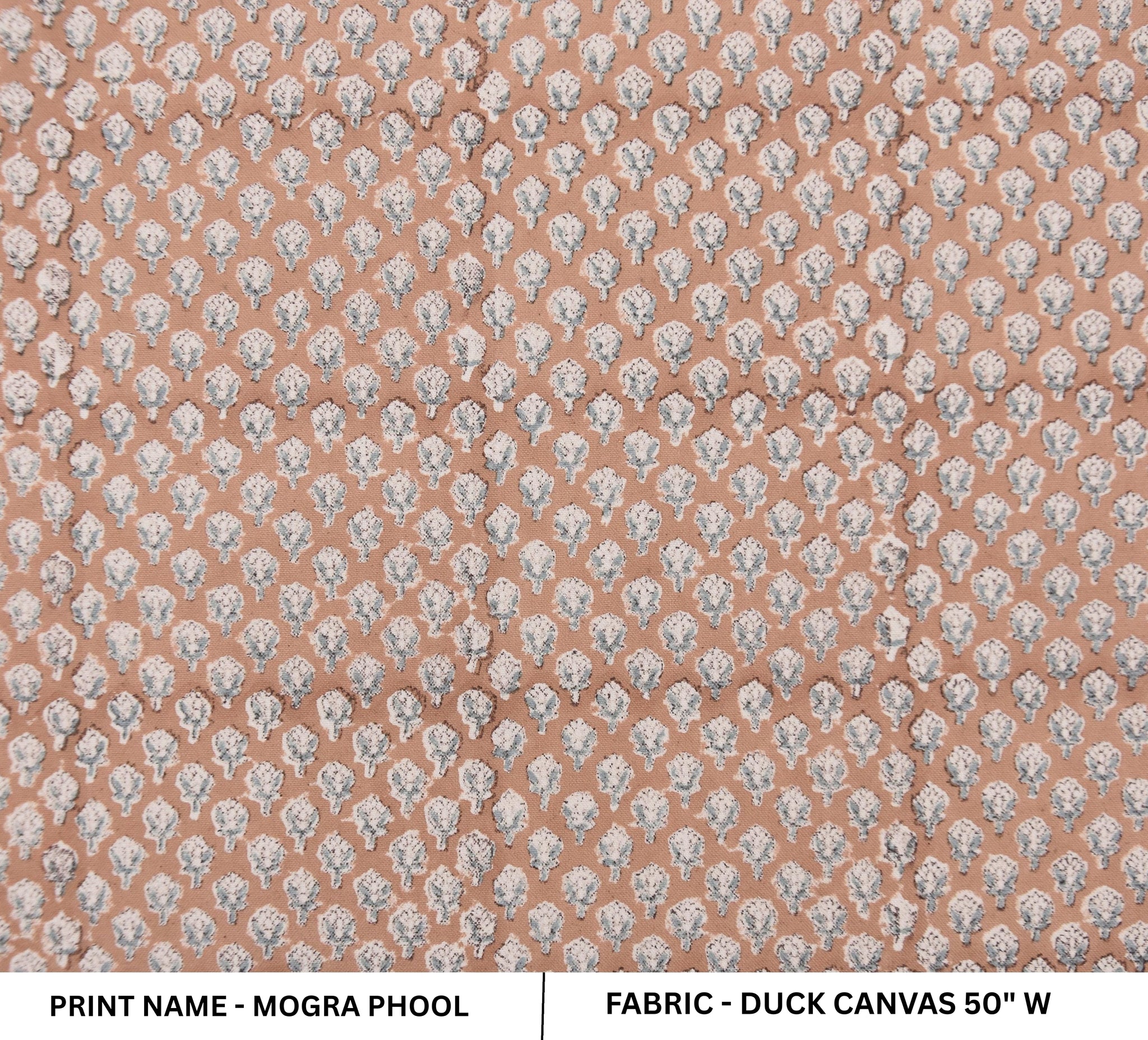 Add rustic charm to your home with the MOGRA PHOOL Duck Canvas Fabric, featuring delicate brown mini floral motifs. Crafted from durable duck canvas, this hand block printed fabric is perfect for creating pillow covers, cushions, or other decorative home accents.