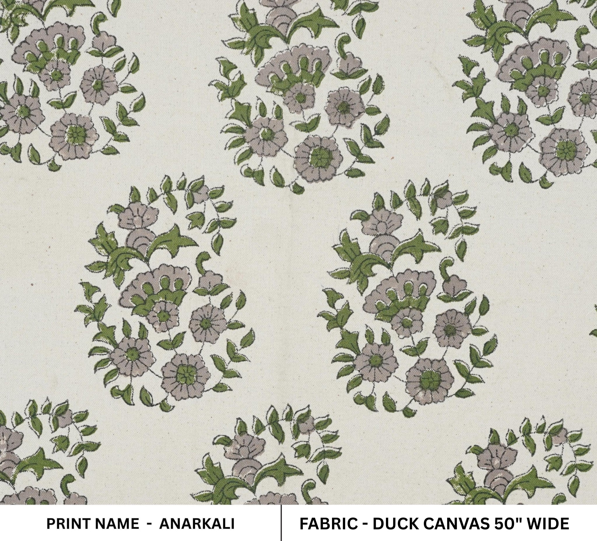Elevate your home decor with the ANARKALI Hand-Stamped Duck Canvas Fabric. Crafted from durable duck canvas, this fabric features a charming beige and green floral design created using traditional hand-stamping techniques. Ideal for curtains, window treatments, upholstery, and DIY decor projects, this versatile fabric combines strength, breathability and artisanal beauty. Each piece is handcrafted, making every cut unique and full of character.