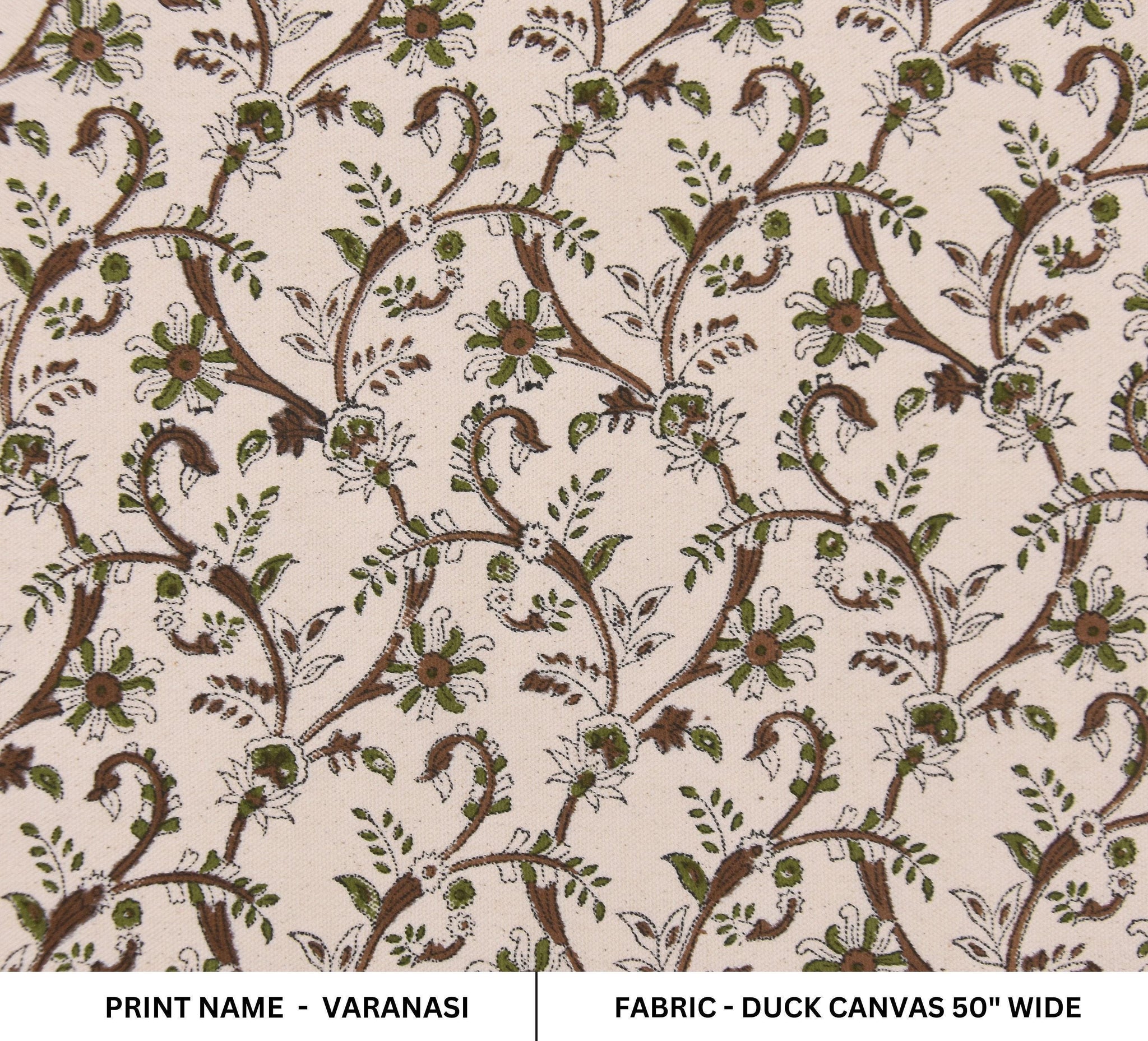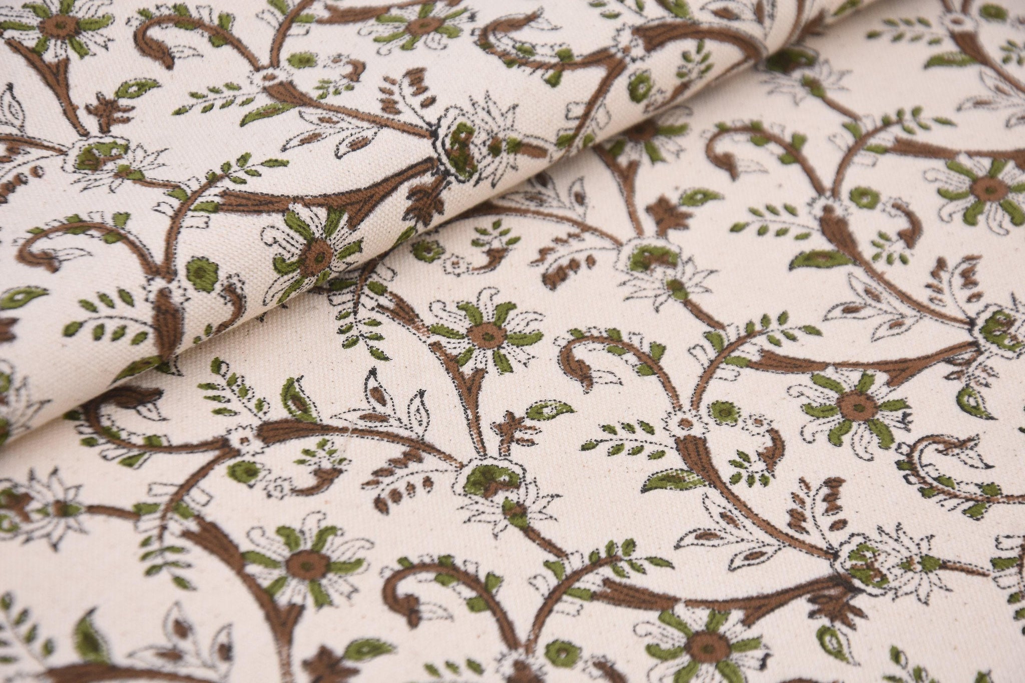 Handcrafted Wooden Block Print Duck Canvas Brown and Green Floral Fabric for Farmhouse & Window Shade – VARANASI