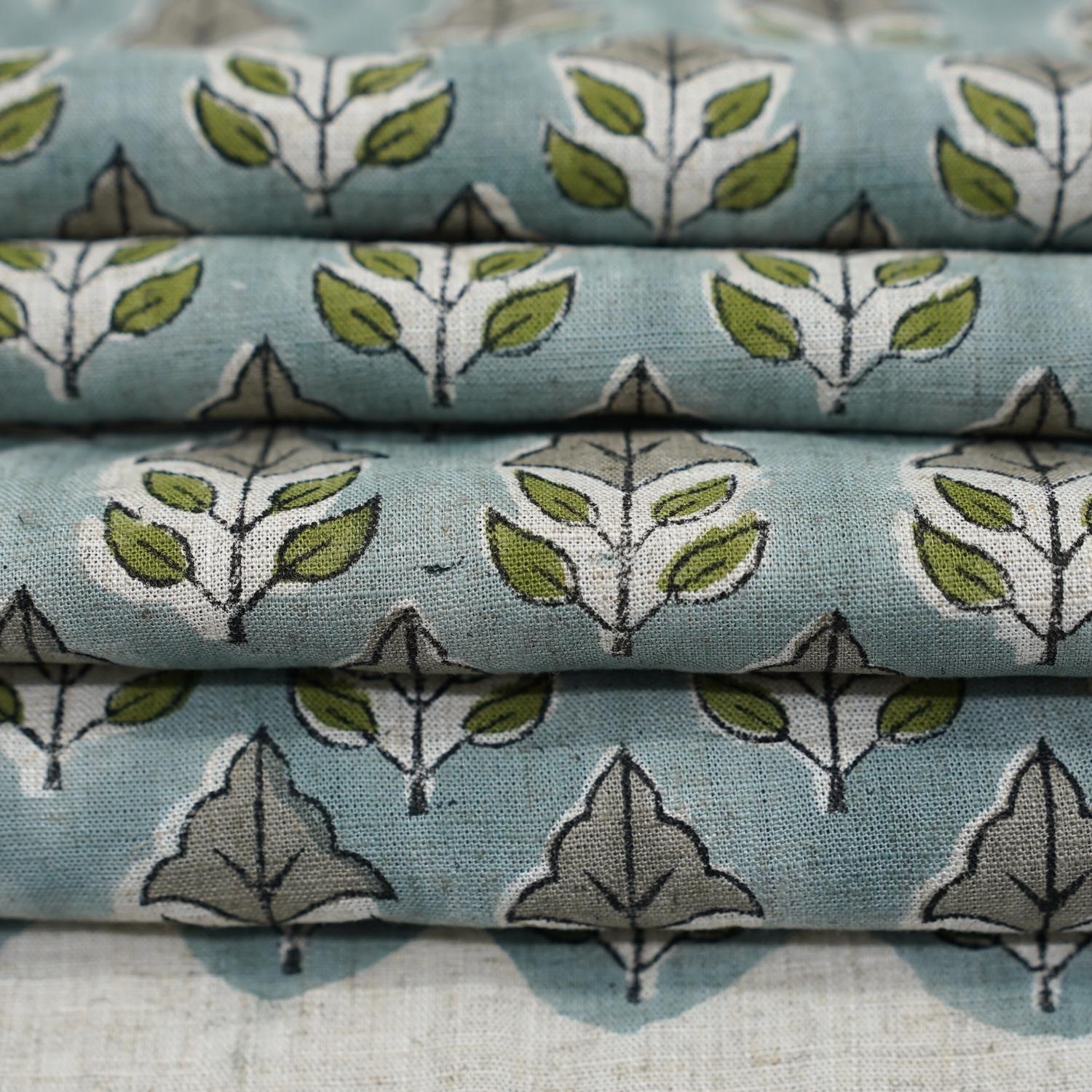 HANDMADE BLOCK PRINTED FLORAL GRAY & GREEN NATURAL VISCOSE LINEN FABRIC - MAYUR