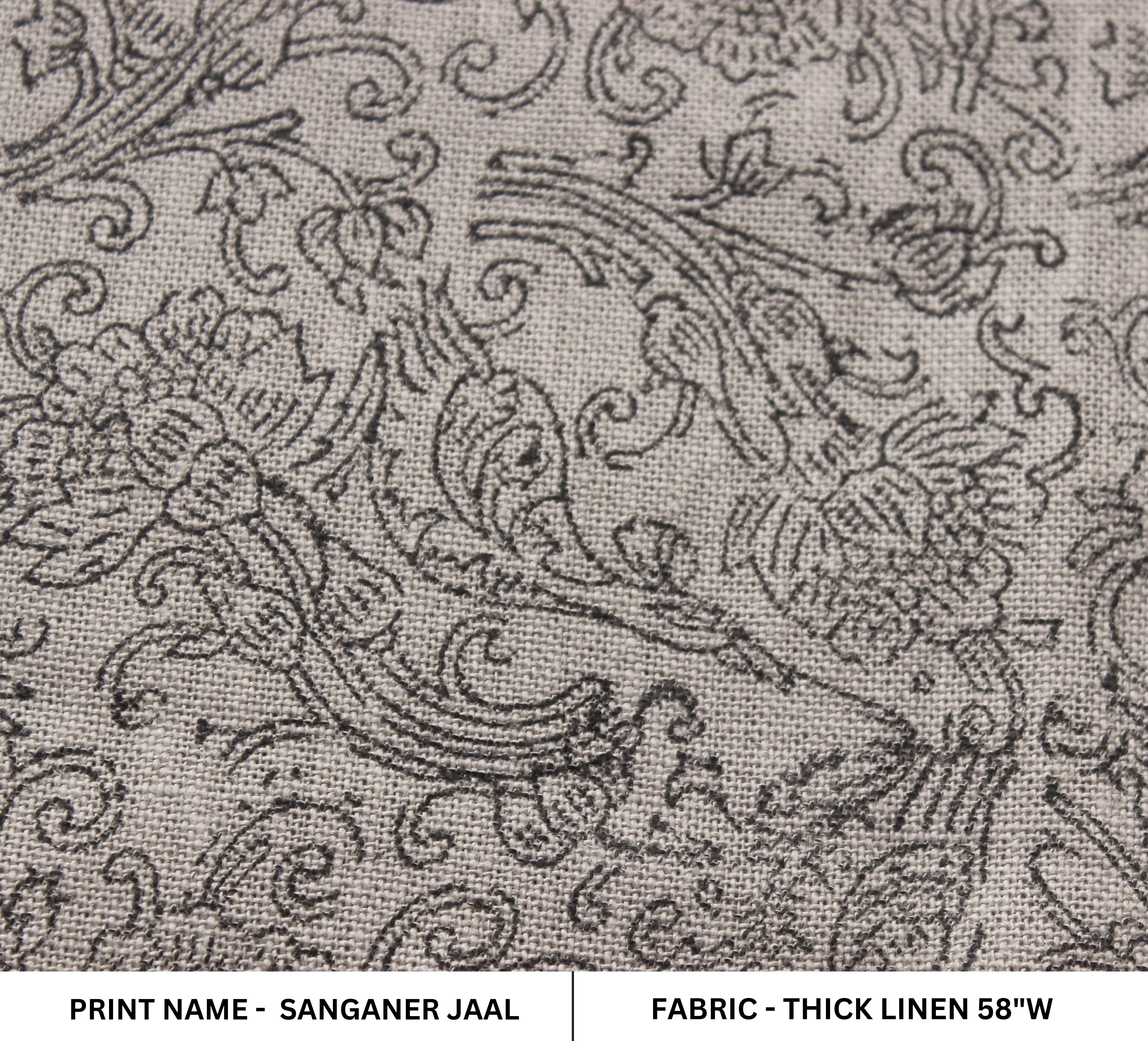 Fabritual’s SANGANER JAAL Thick Linen hand block print fabric offers an elegant fusion of traditional craftsmanship and contemporary refinement in every yard. Transform your home with this stylish fabric featuring intricate floral patterns. Perfect for upholstery, it lends an air of elegance to sofas, chairs, and cushions, offering durability and a touch of luxury for any space. Hand-stamped and dyed with vegetable-based dyes, this eco-conscious, heavy-weight linen reflects Fabritual’s dedication to sustainability and the preservation of traditional Indian craftsmanship in home décor. Our team of 200 skilled artisans at Fabritual has crafted an innovative organic hand block printing technique on heavy-duty linen and cotton, offering unmatched quality and durability for home décor projects, where elegance meets sustainability.