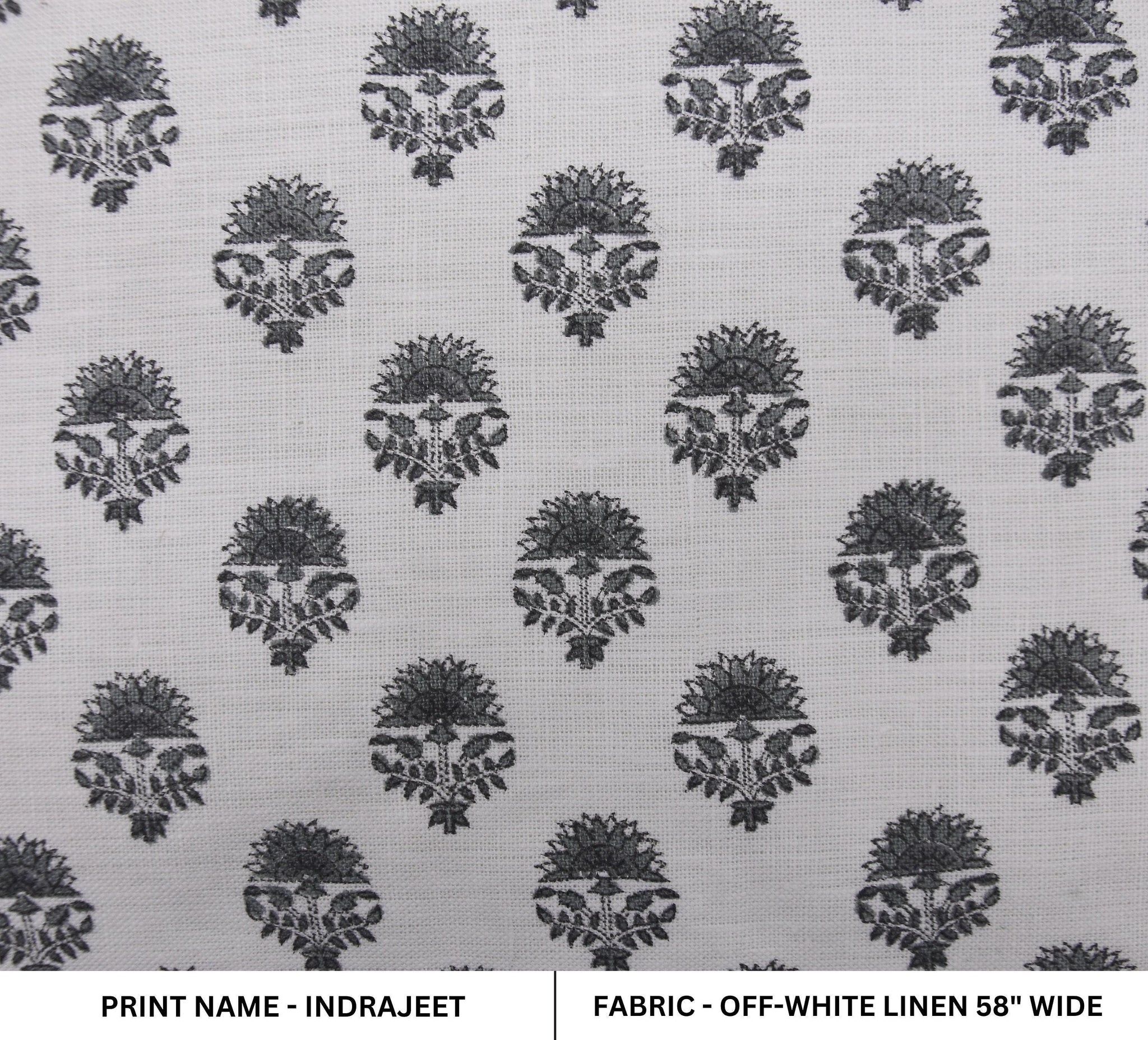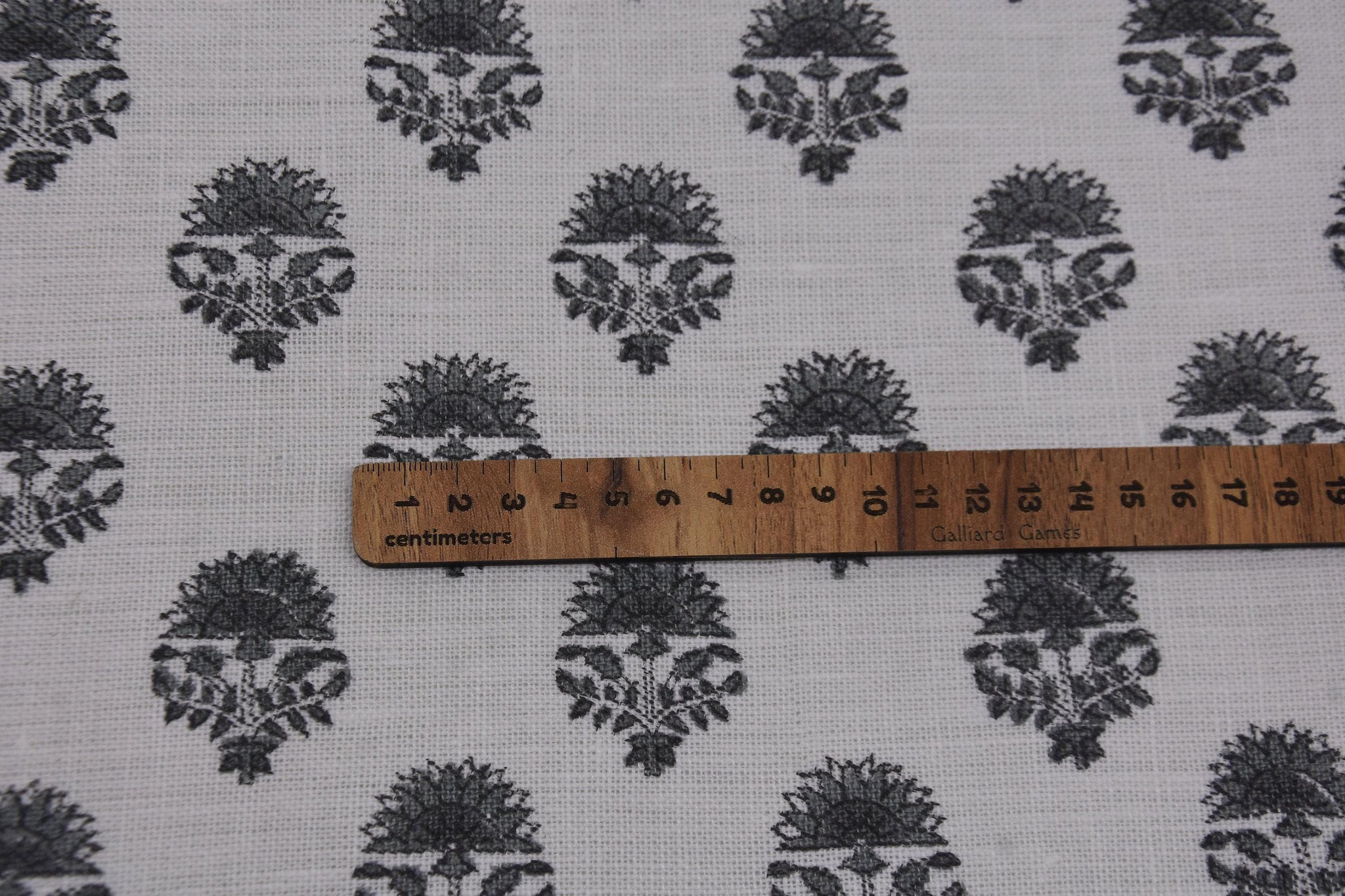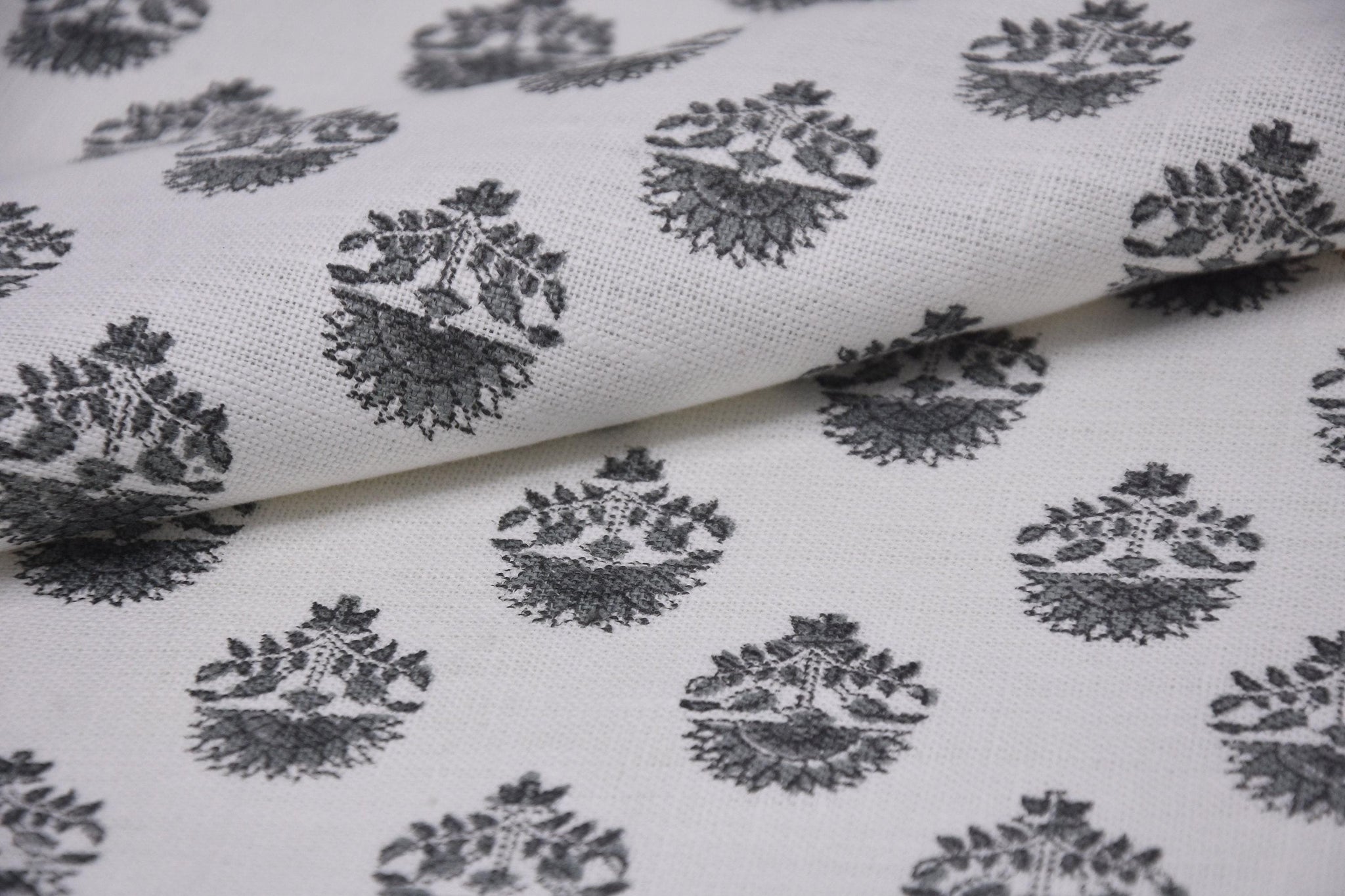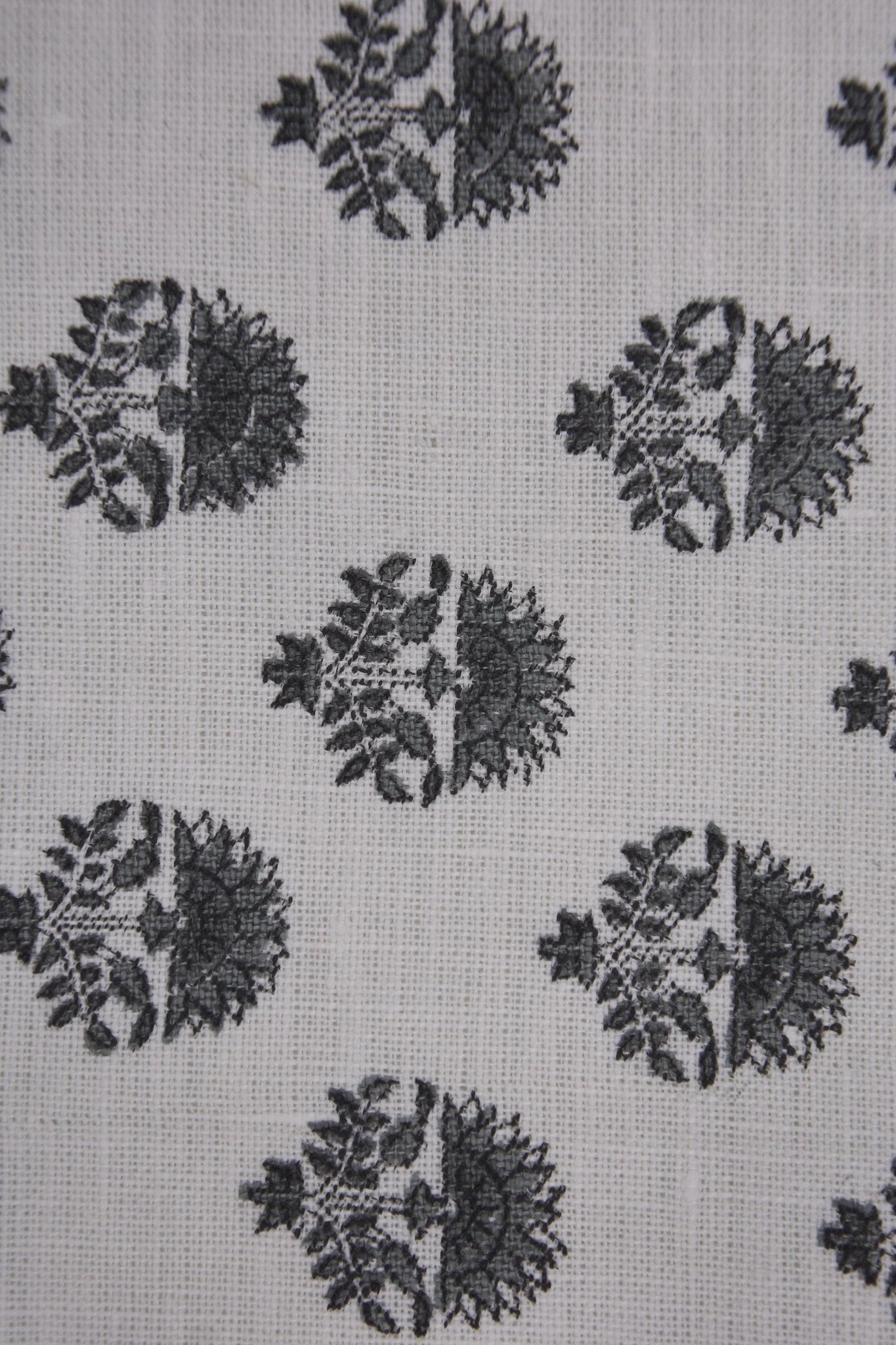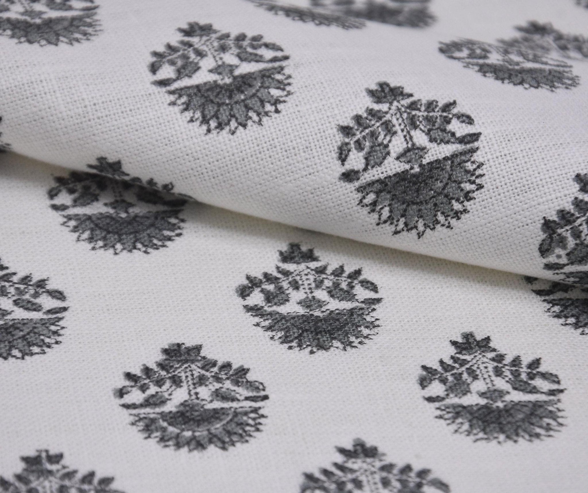 Hand Stamped Block Printed Off-White Gray Floral Linen Fabric 58" Wide for Curtains – INDRAJEET