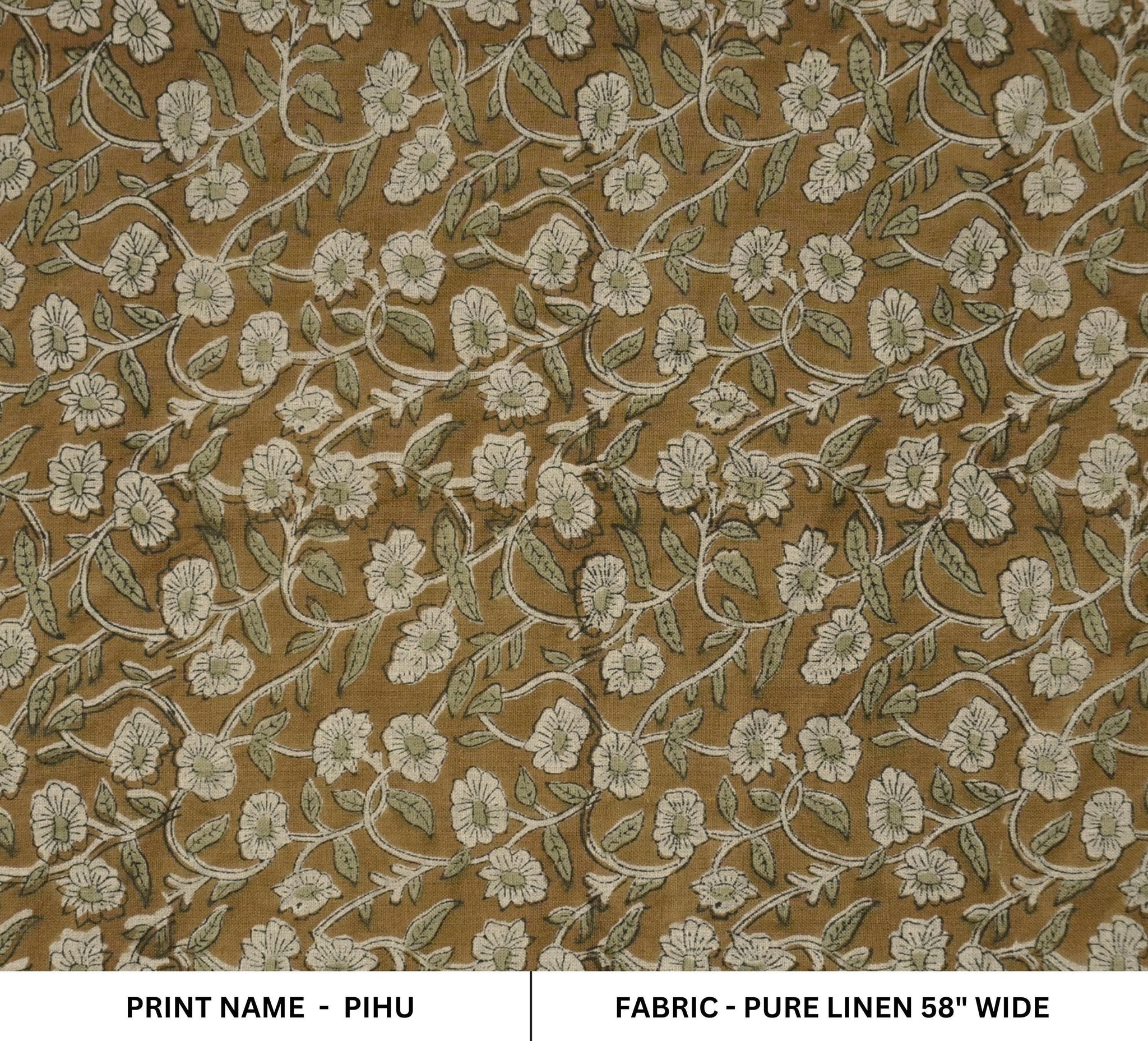 Block Printed Handcrafted Gold Fusion Floral 100% Pure Linen Fabric Indian Textile for Curtains, Pillow Covers – PIHU
