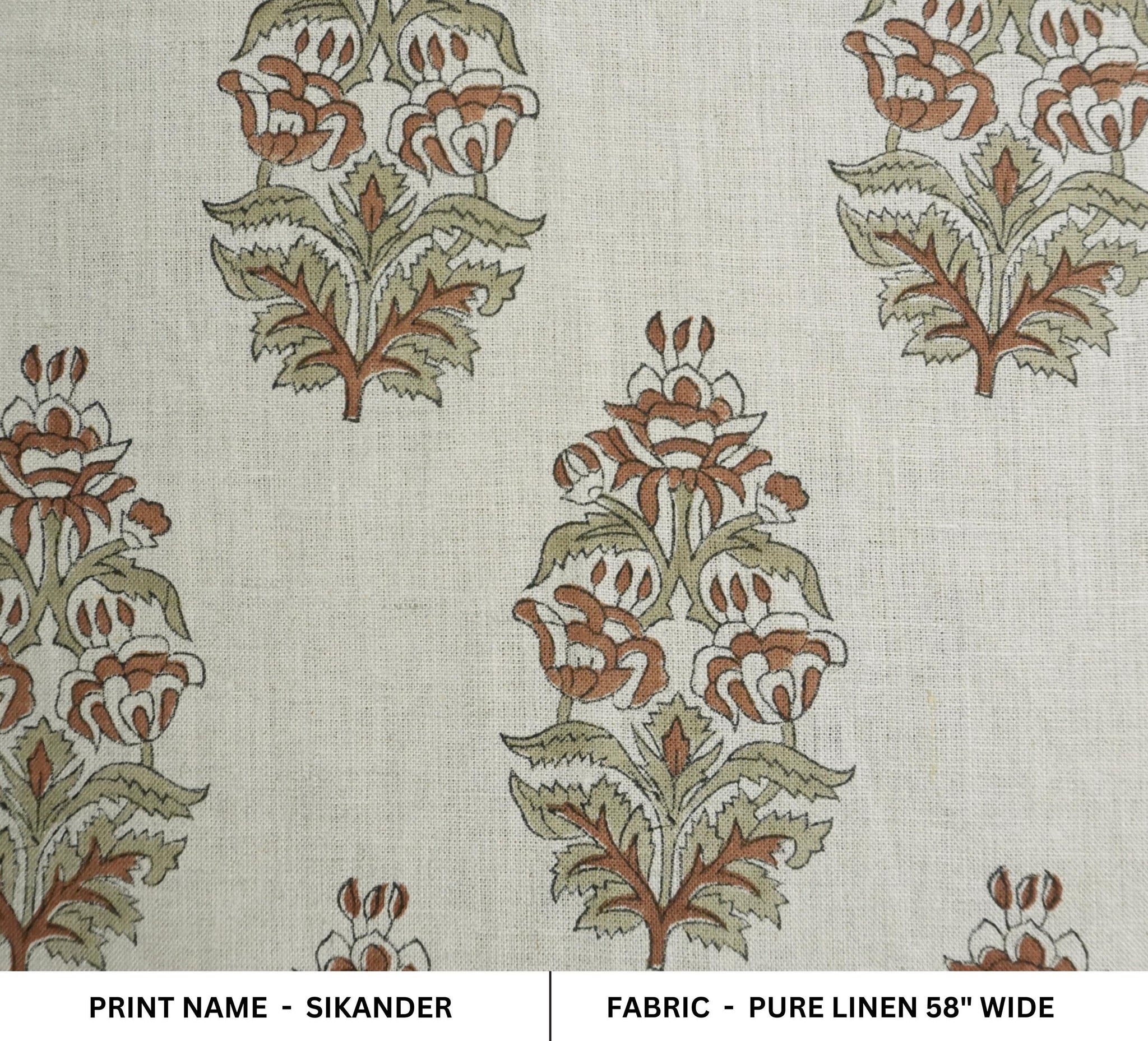 Hand Block Printed 100% Pure Linen Brown & Sage Green Floral Decorative Fabric for Farmhouse Decor - Sikander