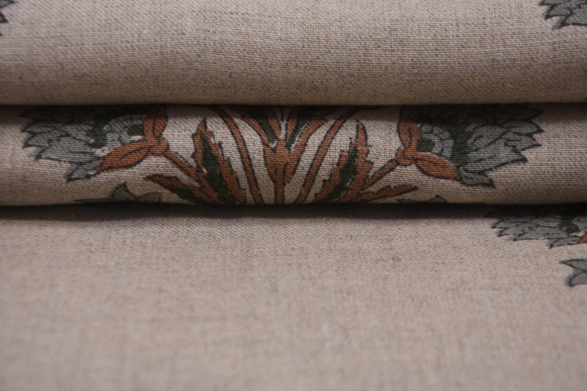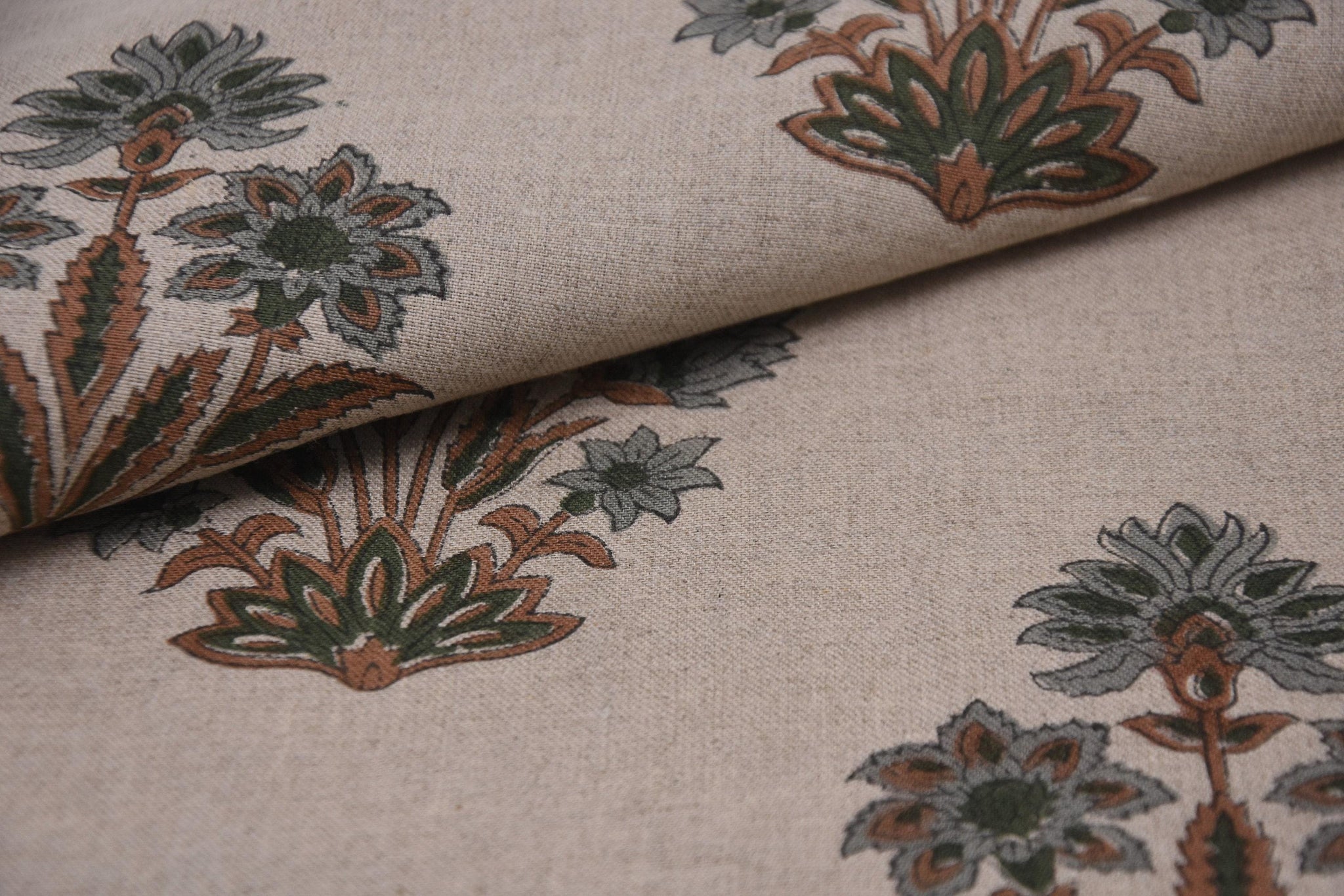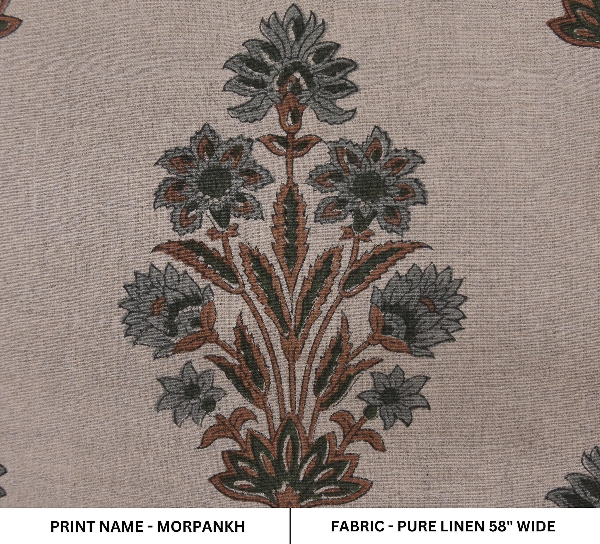 Enhance your bedroom and living spaces with the Morpankh Handcrafted Block Print Linen Fabric. Made from 100% pure linen, this fabric features exquisite hand block printed designs, ideal for creating decorative cushions, tablecloths, napkins, and other home décor accents. Its breathable, durable, and medium-weight texture ensures comfort and long-lasting use. Perfect for adding a touch of artisanal charm and timeless elegance to any room, each yard is carefully handmade, offering unique variations in print and texture.