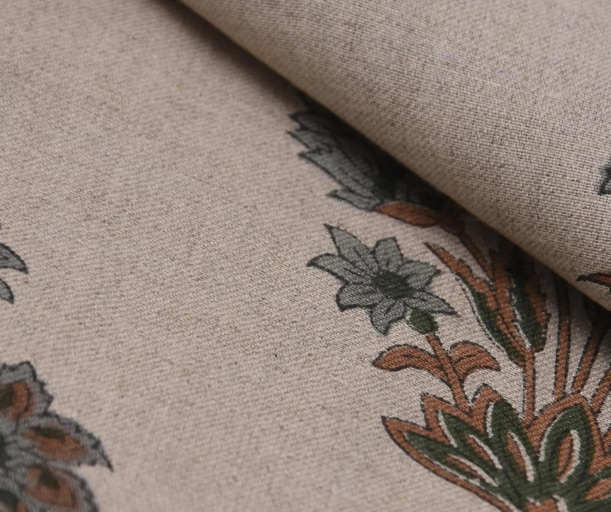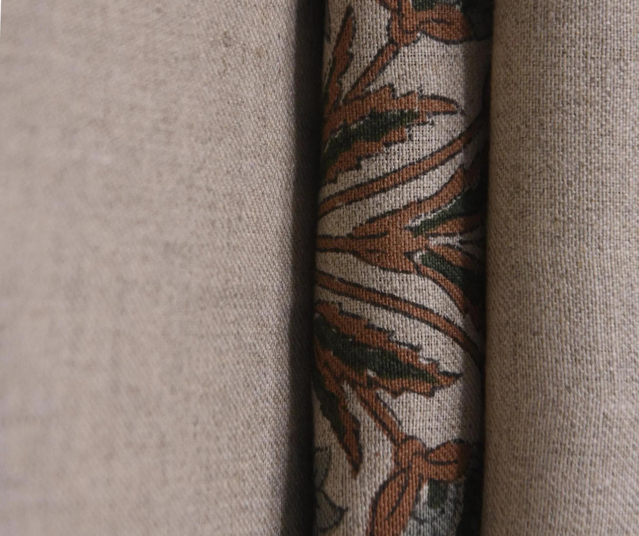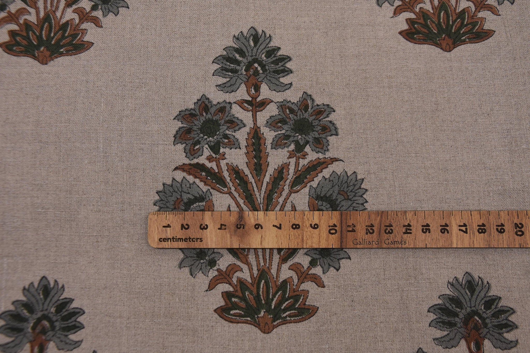 Enhance your bedroom and living spaces with the Morpankh Handcrafted Block Print Linen Fabric. Made from 100% pure linen, this fabric features exquisite hand block printed designs, ideal for creating decorative cushions, tablecloths, napkins, and other home décor accents. Its breathable, durable, and medium-weight texture ensures comfort and long-lasting use. Perfect for adding a touch of artisanal charm and timeless elegance to any room, each yard is carefully handmade, offering unique variations in print and texture.