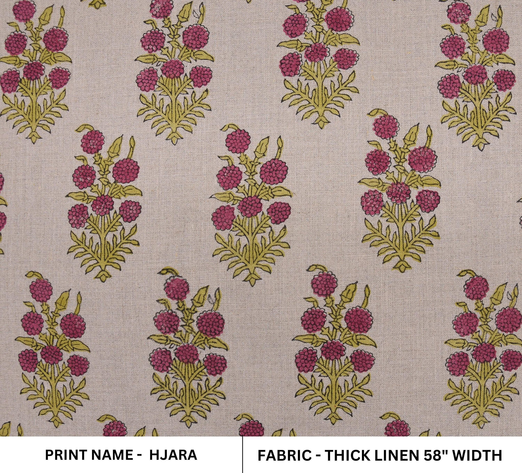 Bring artisanal elegance and vibrant charm to your home with the HJARA Handcrafted Thick Linen Fabric, featuring a striking pink and green big floral block print. Perfect for tablecloths, pillow covers, curtains, and decorative projects, this fabric combines traditional craftsmanship with practical functionality.