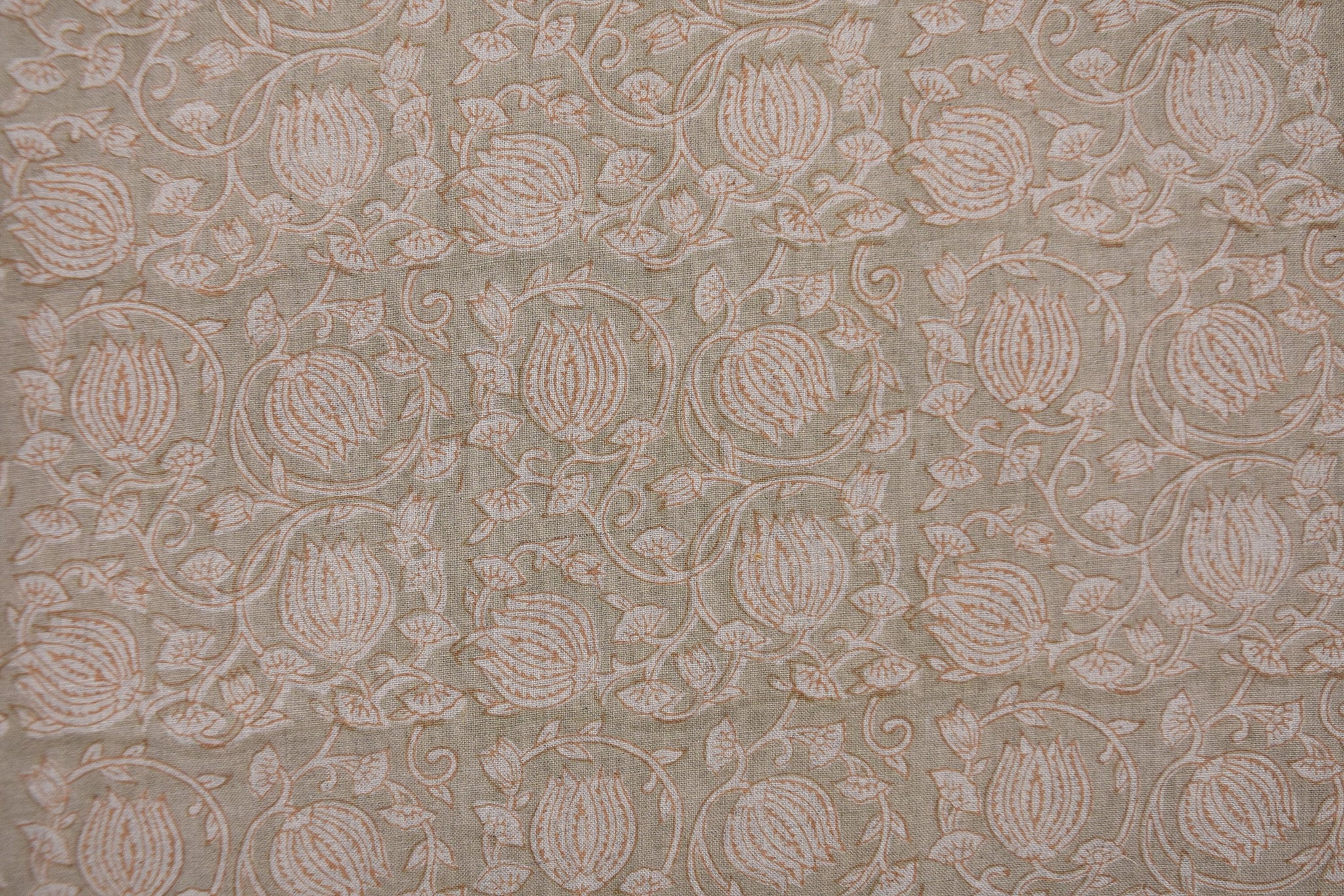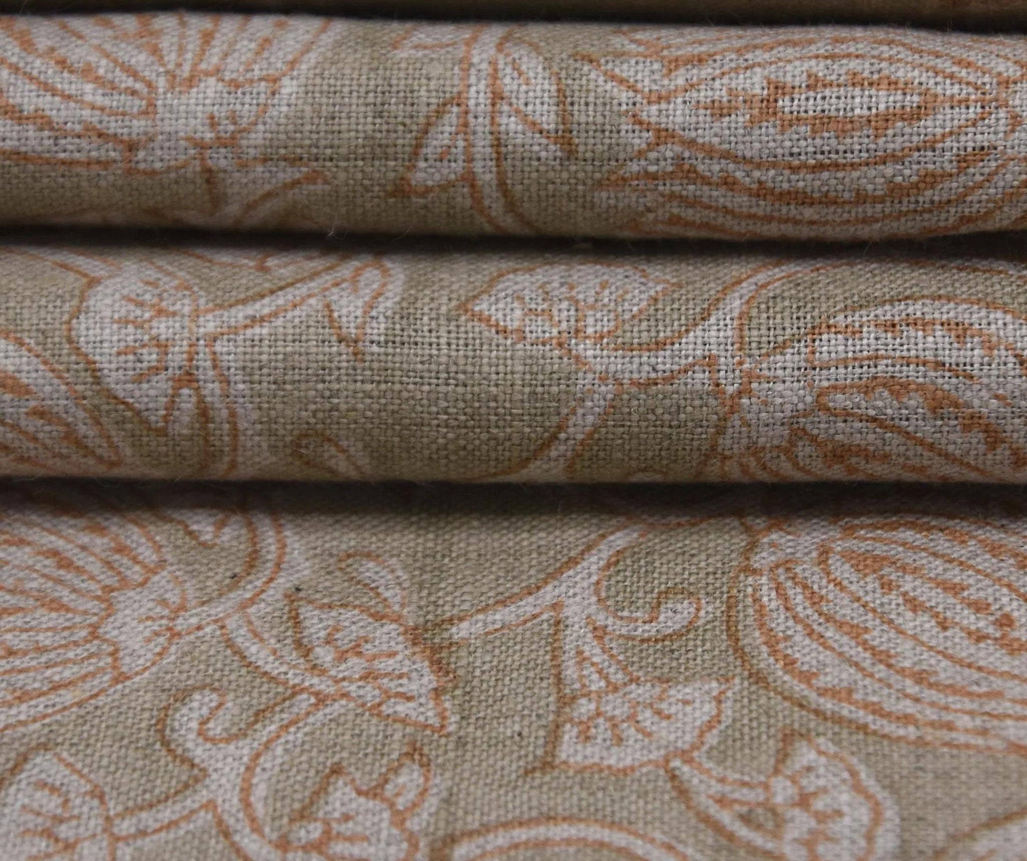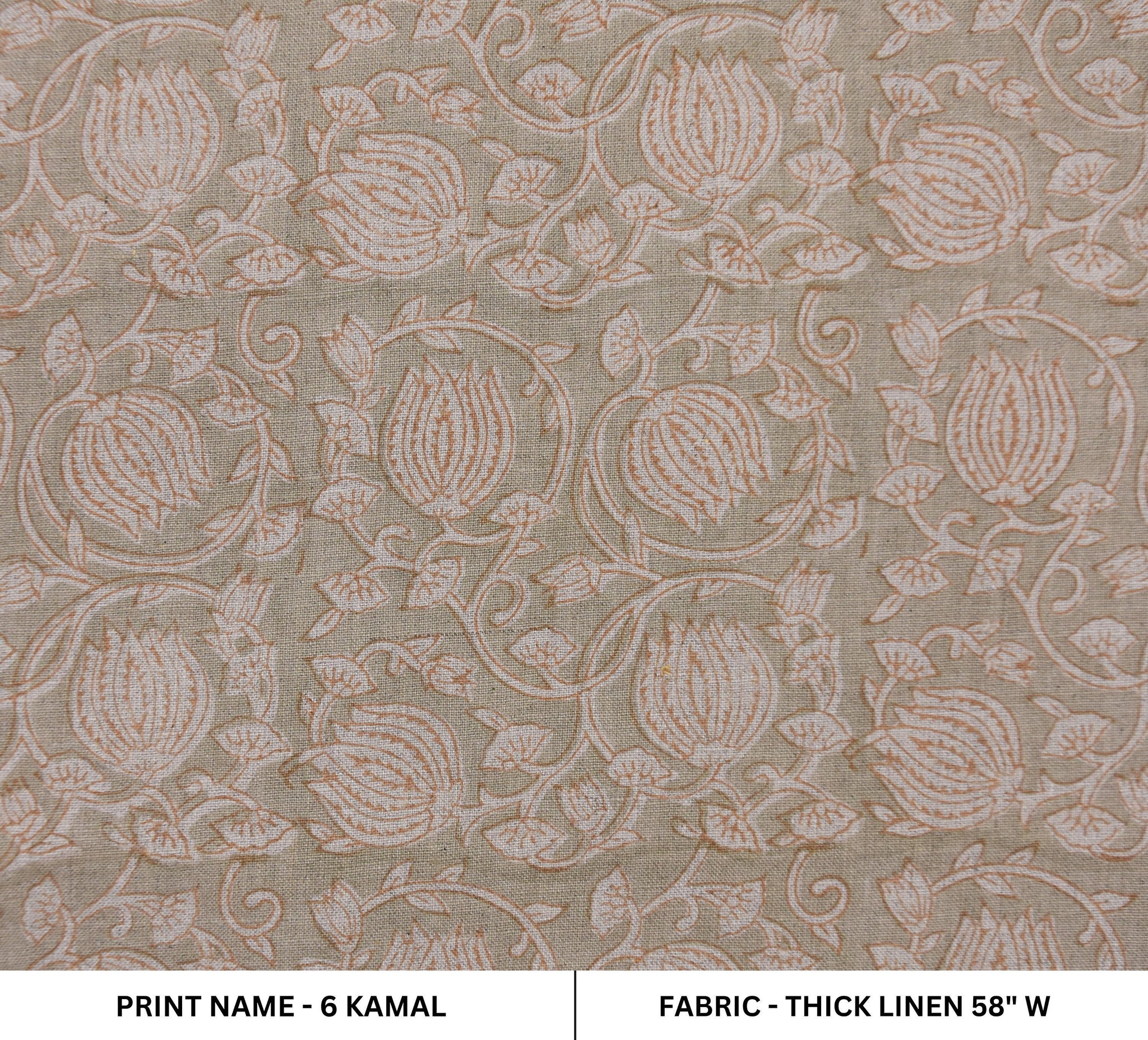 Add timeless charm and artisanal beauty to your home with the 6 KAMAL Hand Block Printed Thick Linen Fabric, showcasing elegant brown and beige floral motifs. Crafted from premium quality pure linen, this 58" wide fabric is perfect for creating cushion covers, window curtains, napkins and decorative upholstery that bring warmth and natural texture to any space.