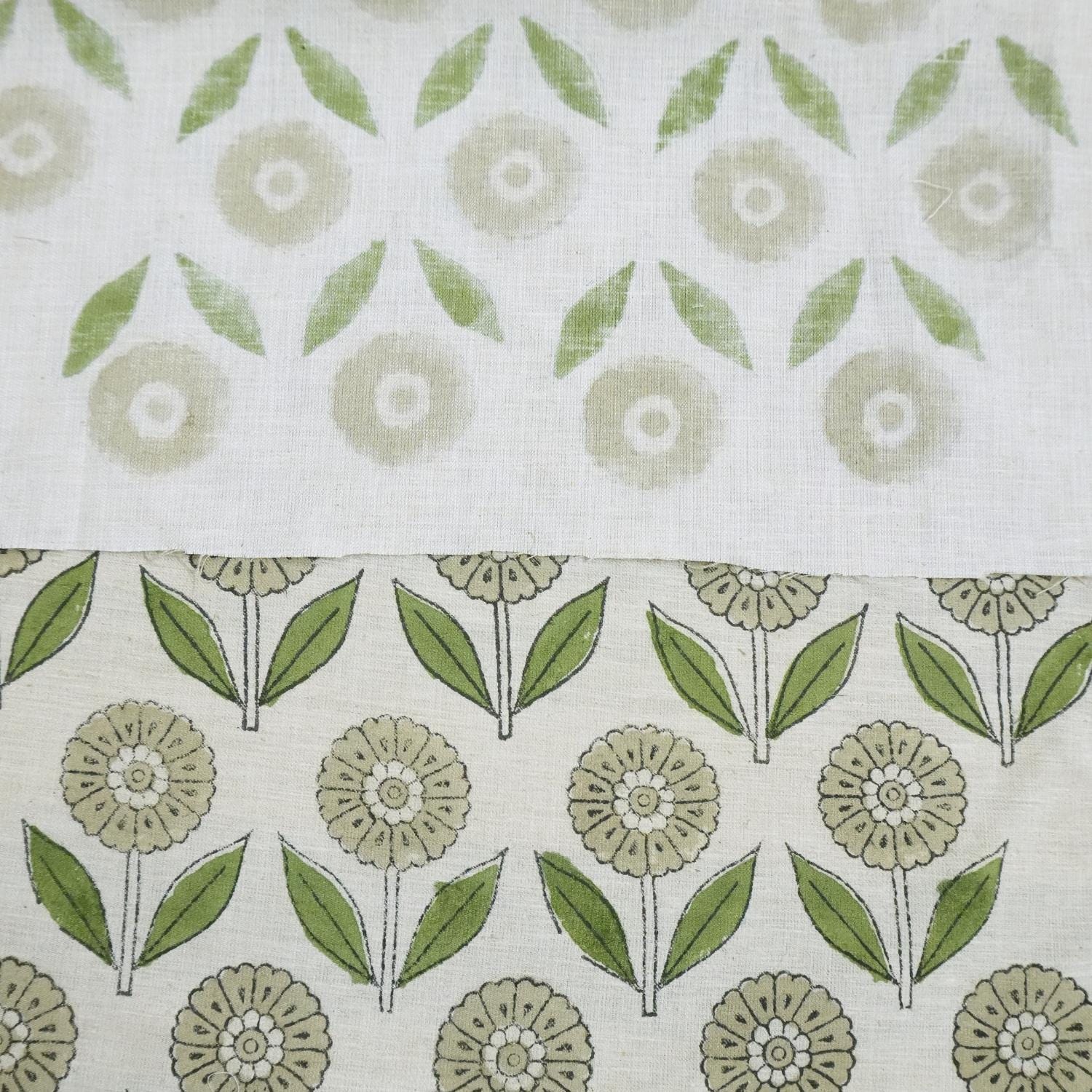 Handcrafted Block Printed Linen Blend Natural Cushion Fabric Green Floral for Living Room - Genda Pushp