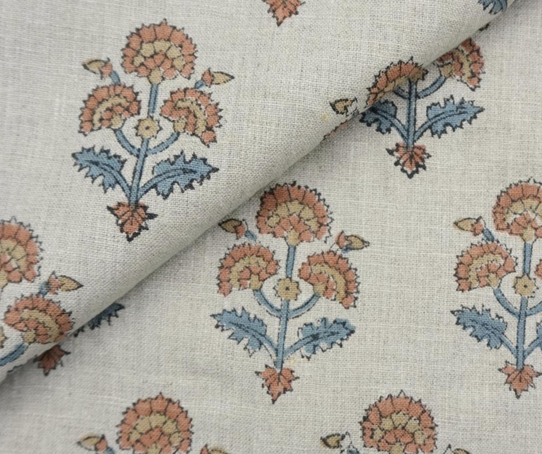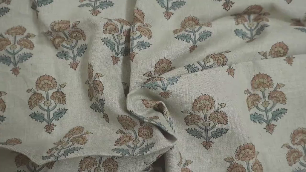 Bring a touch of artisanal elegance to your home with the TRAFFIC LIGHT Handcrafted Pure Linen Fabric. Featuring delicate brown and blue floral motifs, this fabric is hand block printed by skilled Indian artisans using traditional wooden block techniques. Made from 100% pure linen, it offers a soft, breathable, and durable texture, making it perfect for pillow covers, couch cushions, table decor and other decorative home projects.