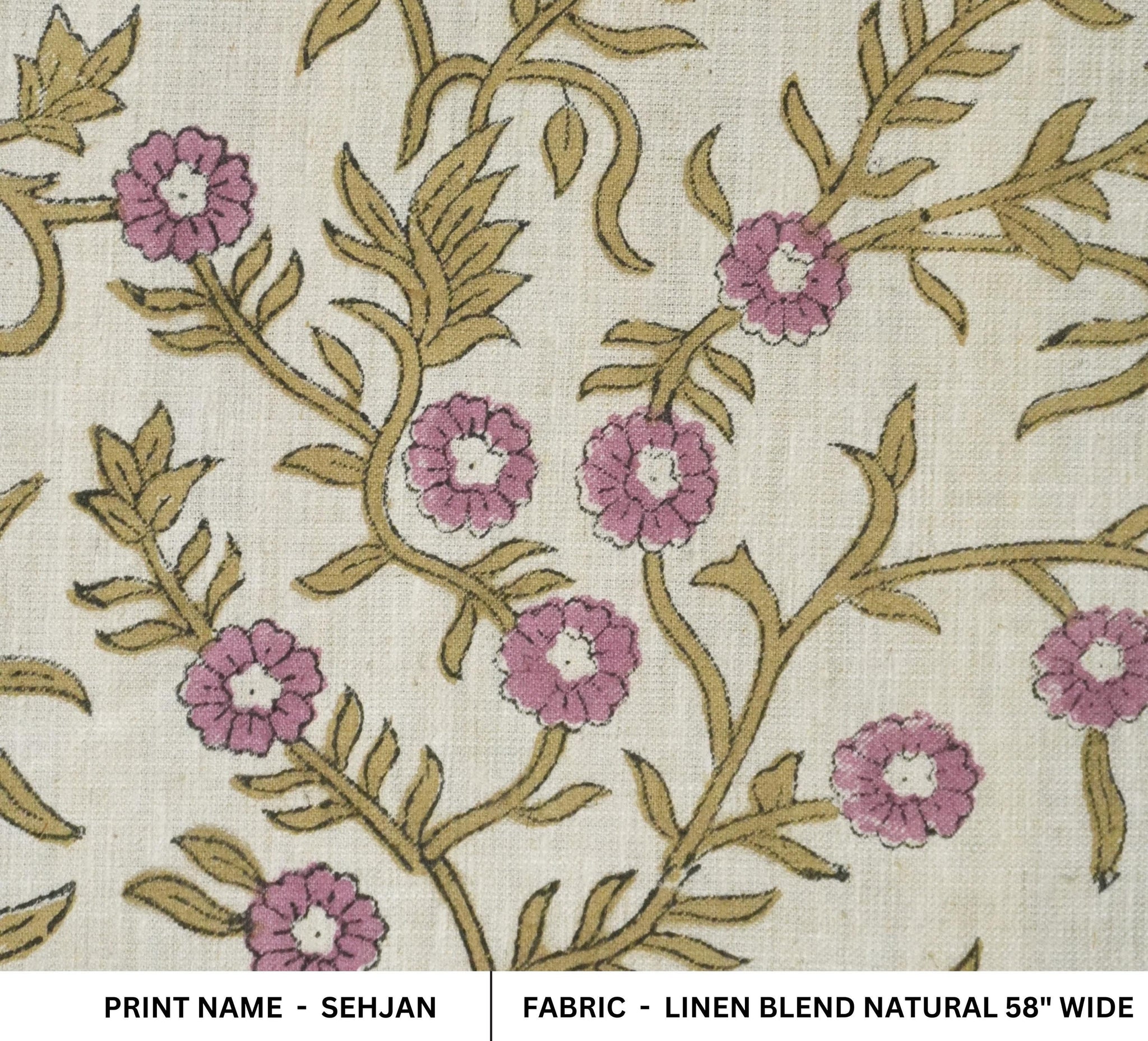 Slight variations in color, print, and texture are natural due to the hand-block printing process, making every piece of Sehjan fabric one-of-a-kind.