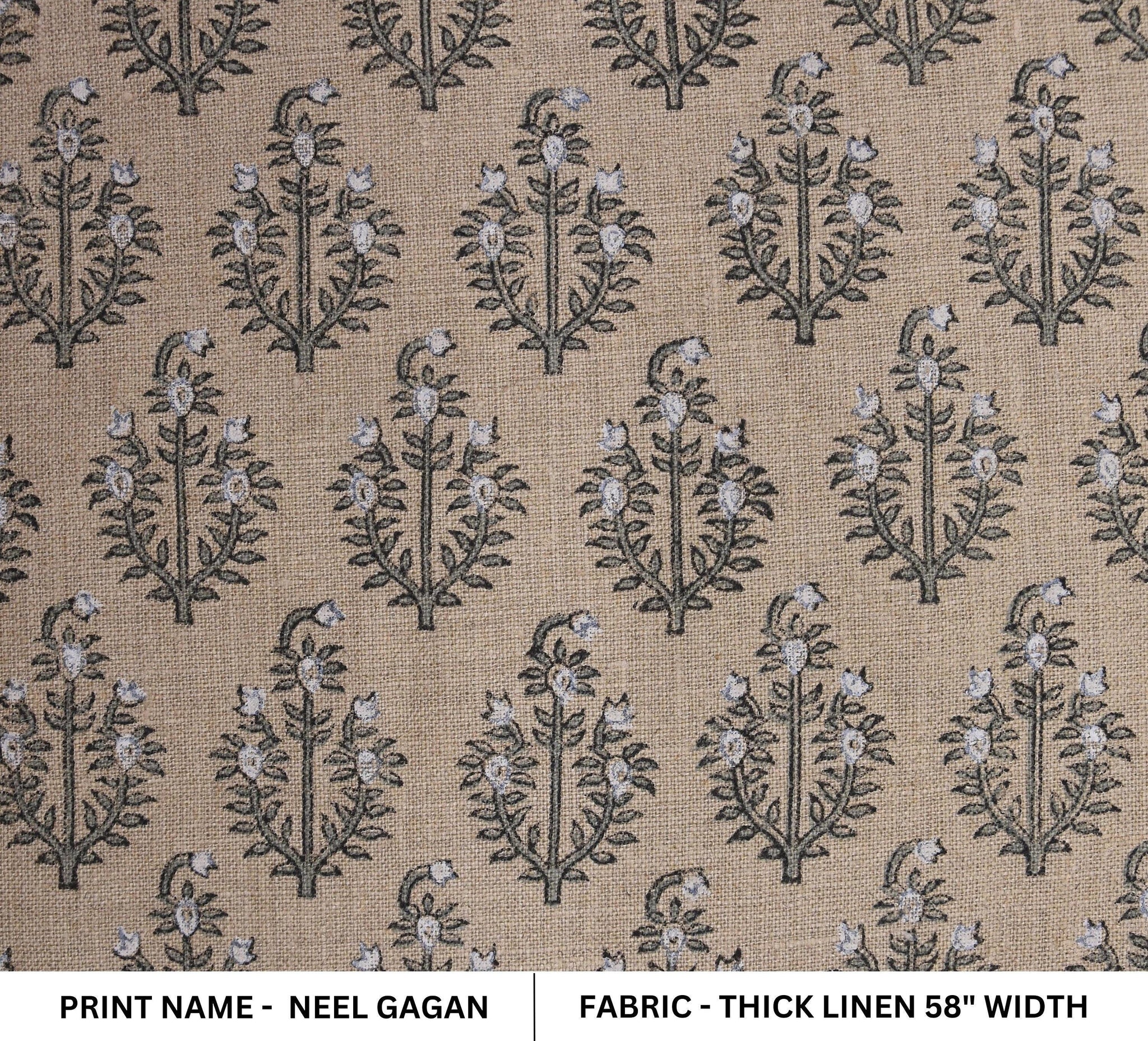 Handmade Indian Block Printed White & Grey Elegant Pure Linen Fabric for Living Room Decor - Neel Gagan