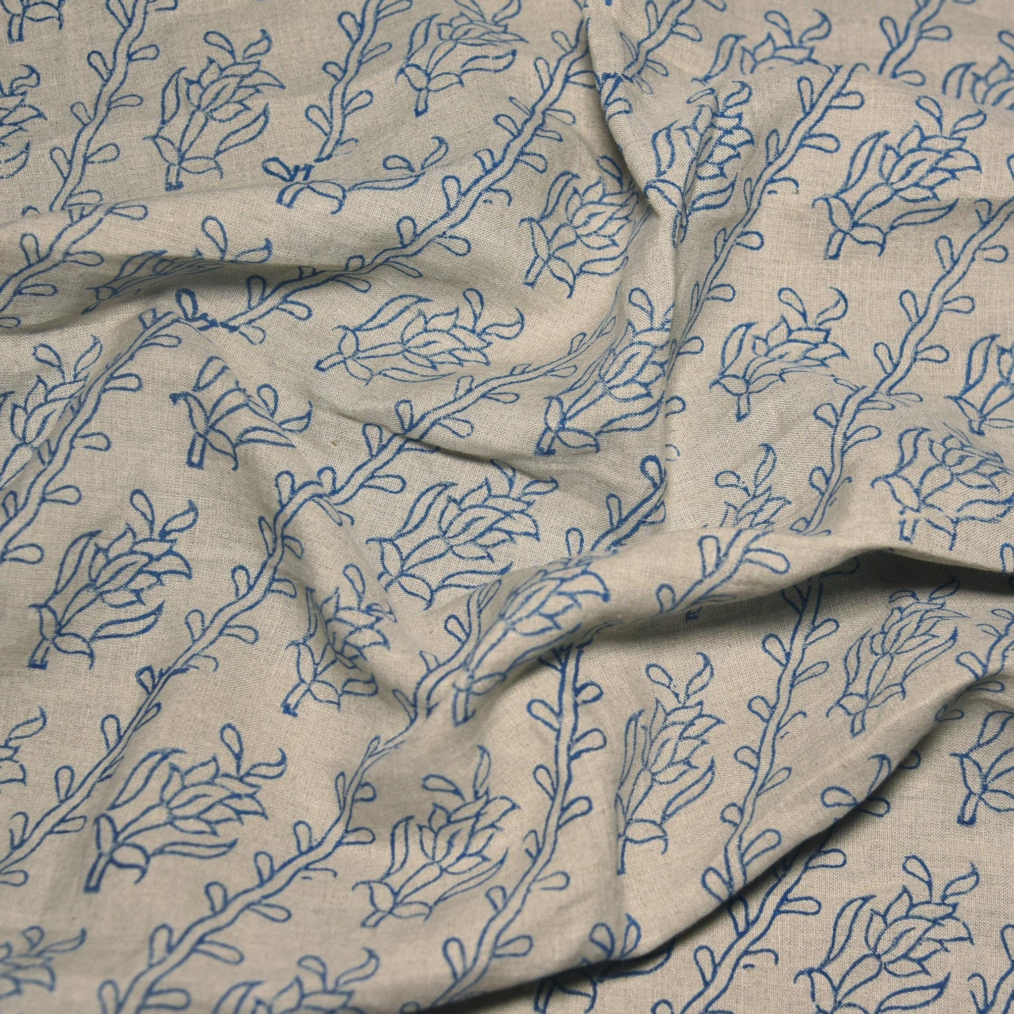 Hand Block Printed Blue Floral Pure Linen Fabric for Pillow Covers & Decorative Home Accents - KYARI
