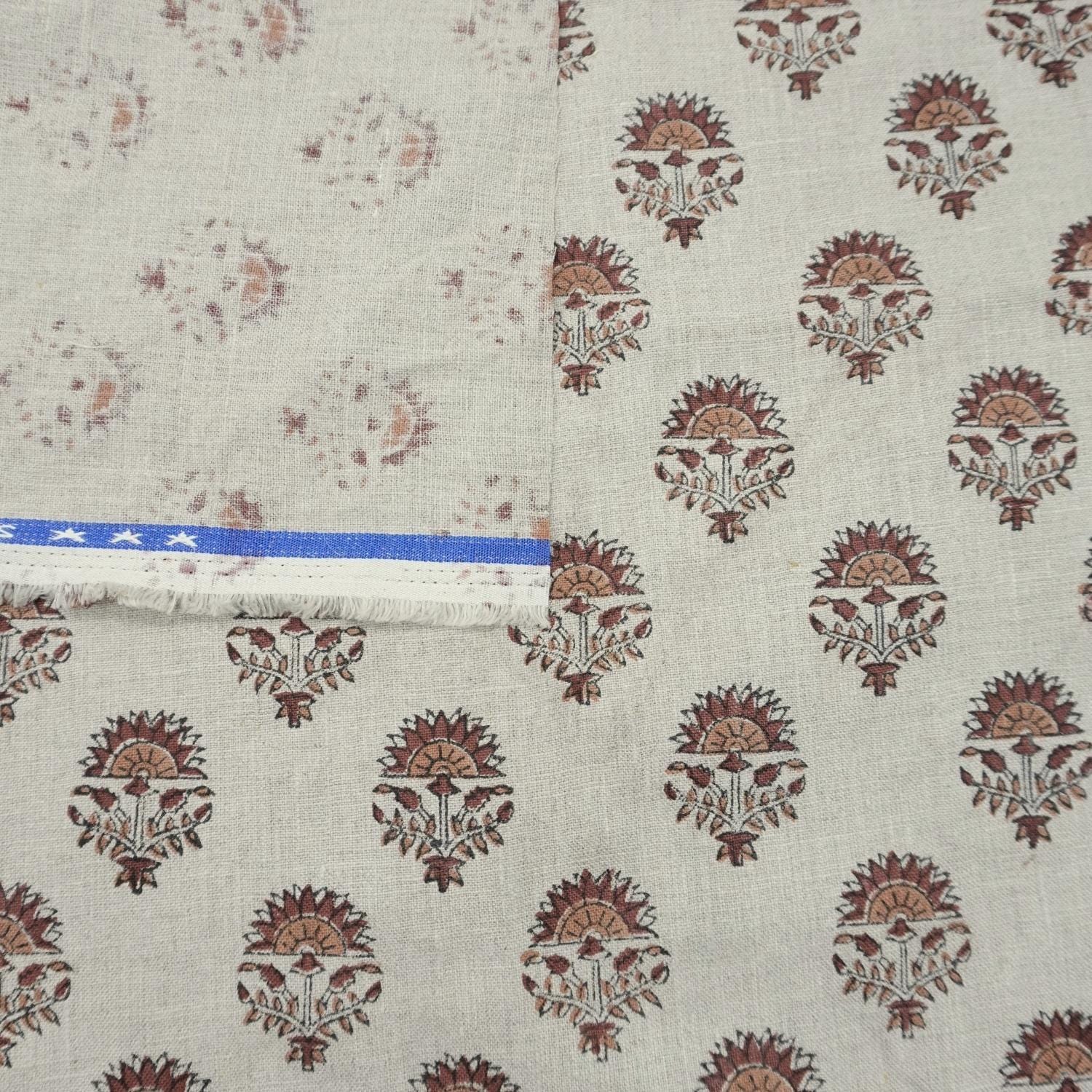 Hand Block Printed Decorative Pure Linen Brown and Gray Floral Fabric for Living Room Decor - INDERJEET