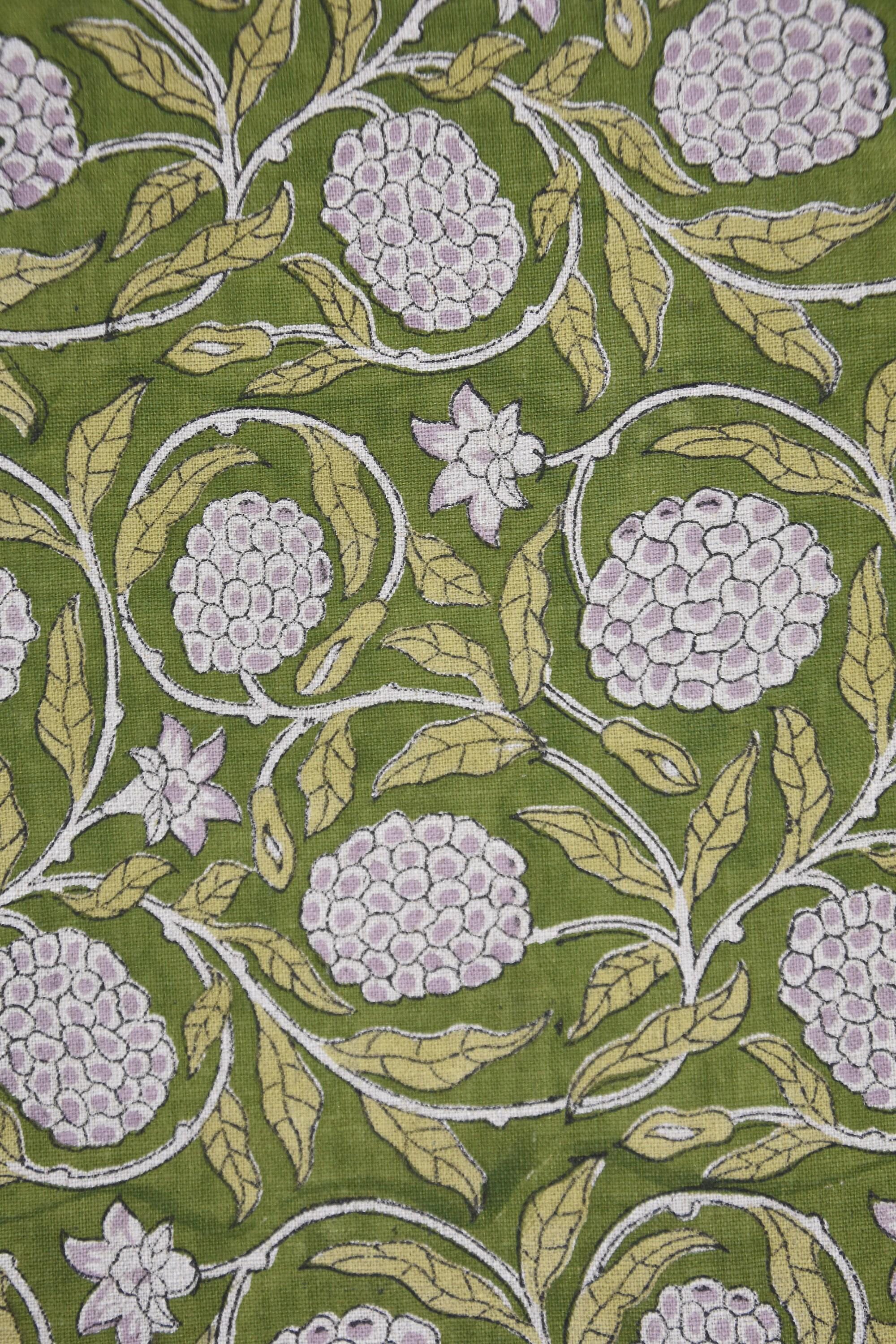 Hand Block Printed Premium Pure Linen Fabric with Green and Gray Floral Indian Art for Window Shades – MERAKI