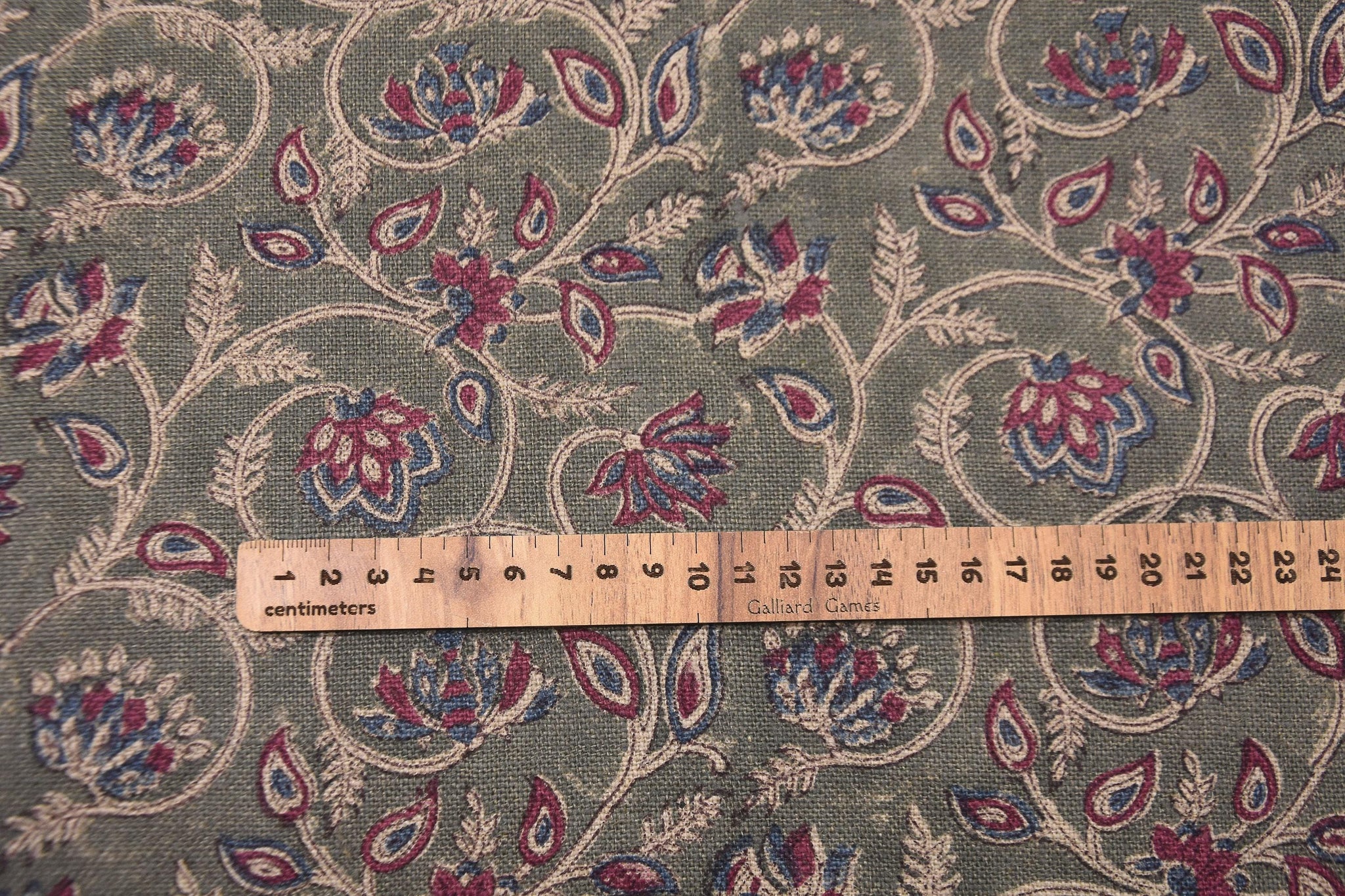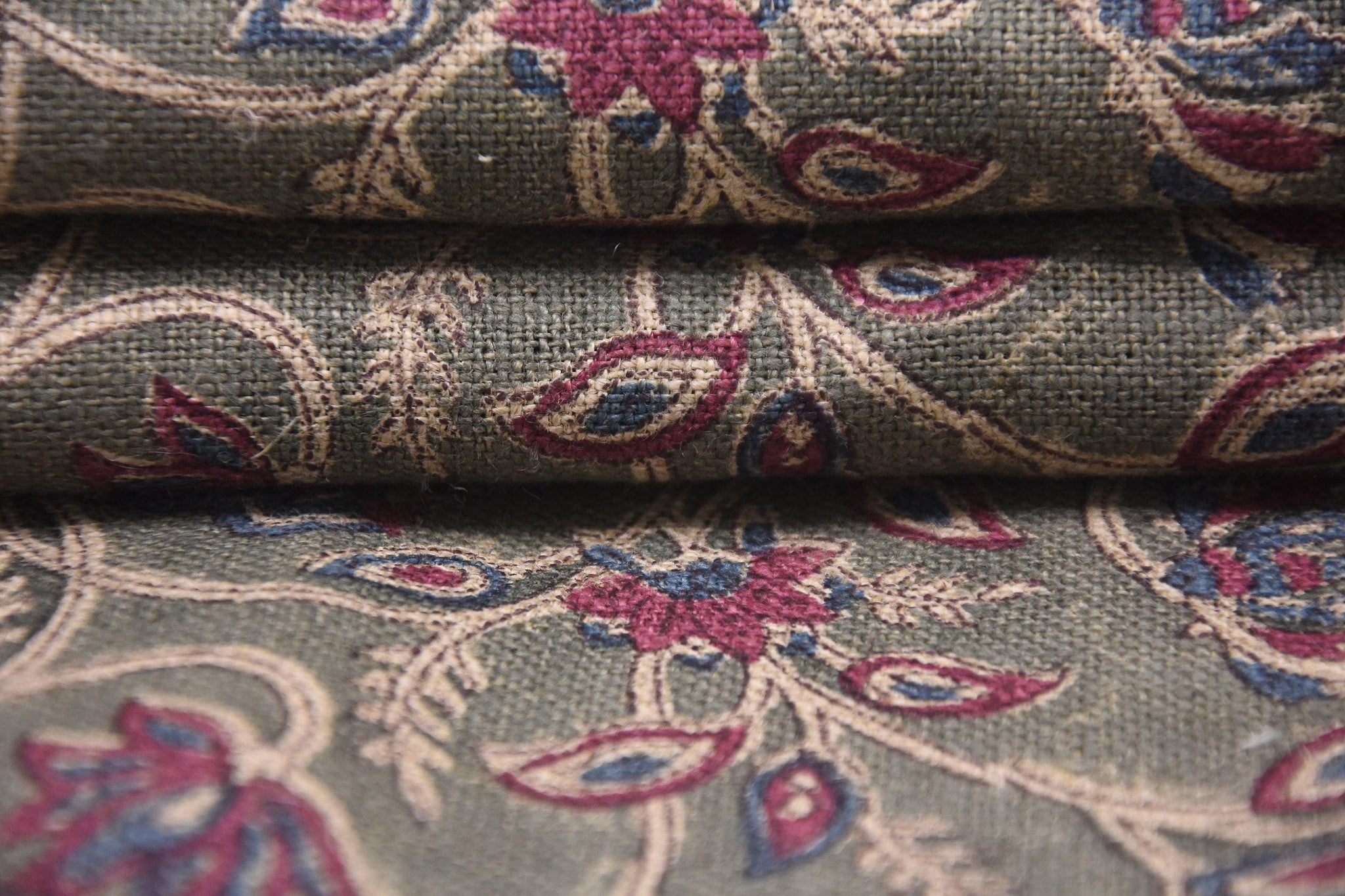 Hand Block Printed Pure Linen Fabric in Rose Pink & Blue Floral for Pillow Covers, Curtains & Upholstery 58" Wide – SARASWATI