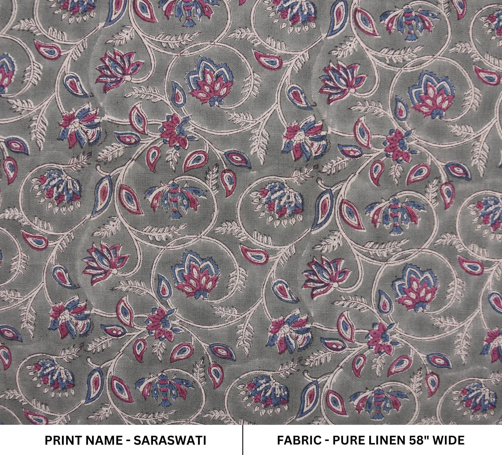 Add vibrant artisanal charm to your home with the SARASWATI Hand Block Printed Pure Linen Fabric, featuring delicate pink and blue floral motifs. This premium fabric is ideal for creating pillow covers, curtains, upholstery, and other decorative projects, blending traditional craftsmanship with modern functionality.