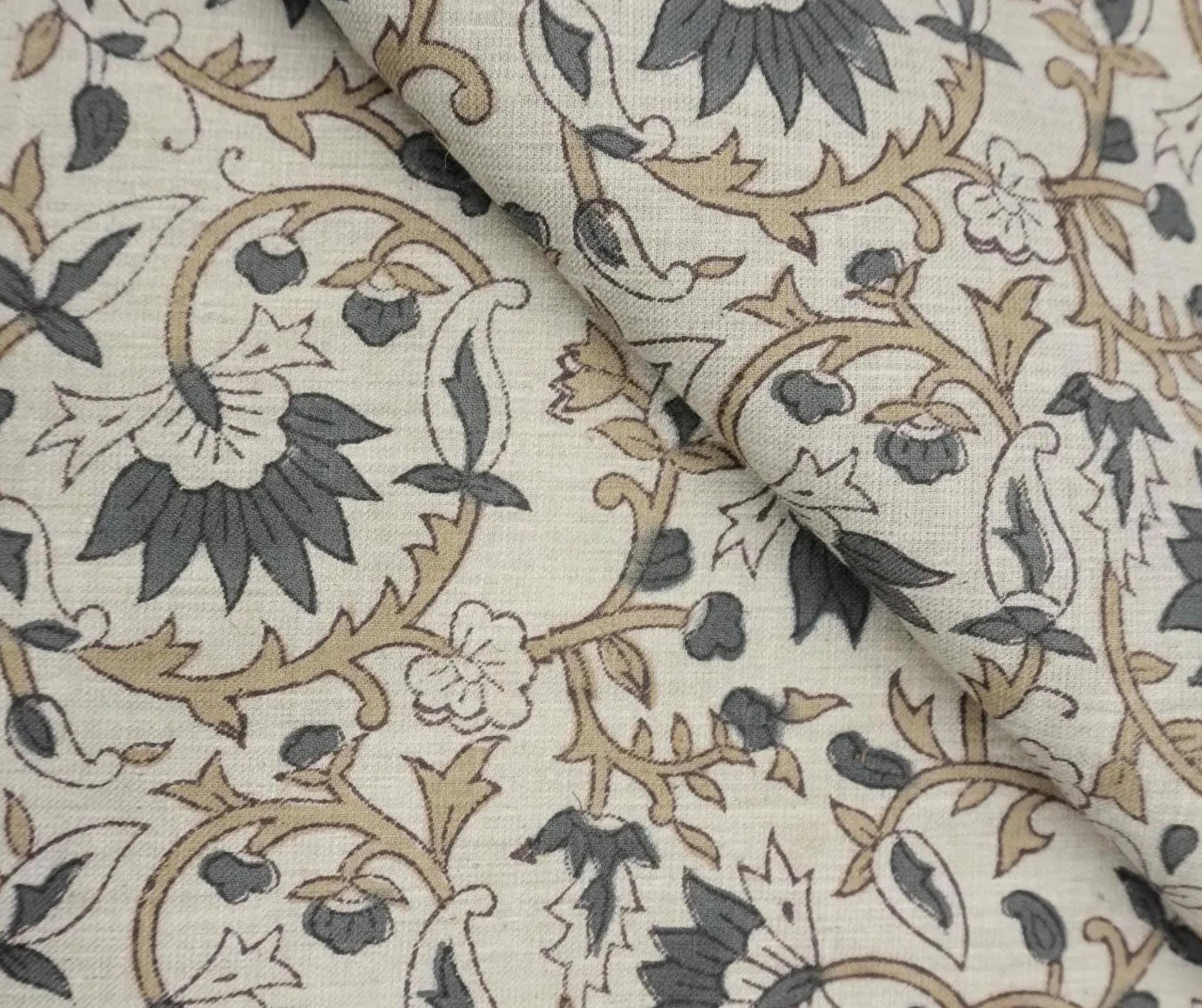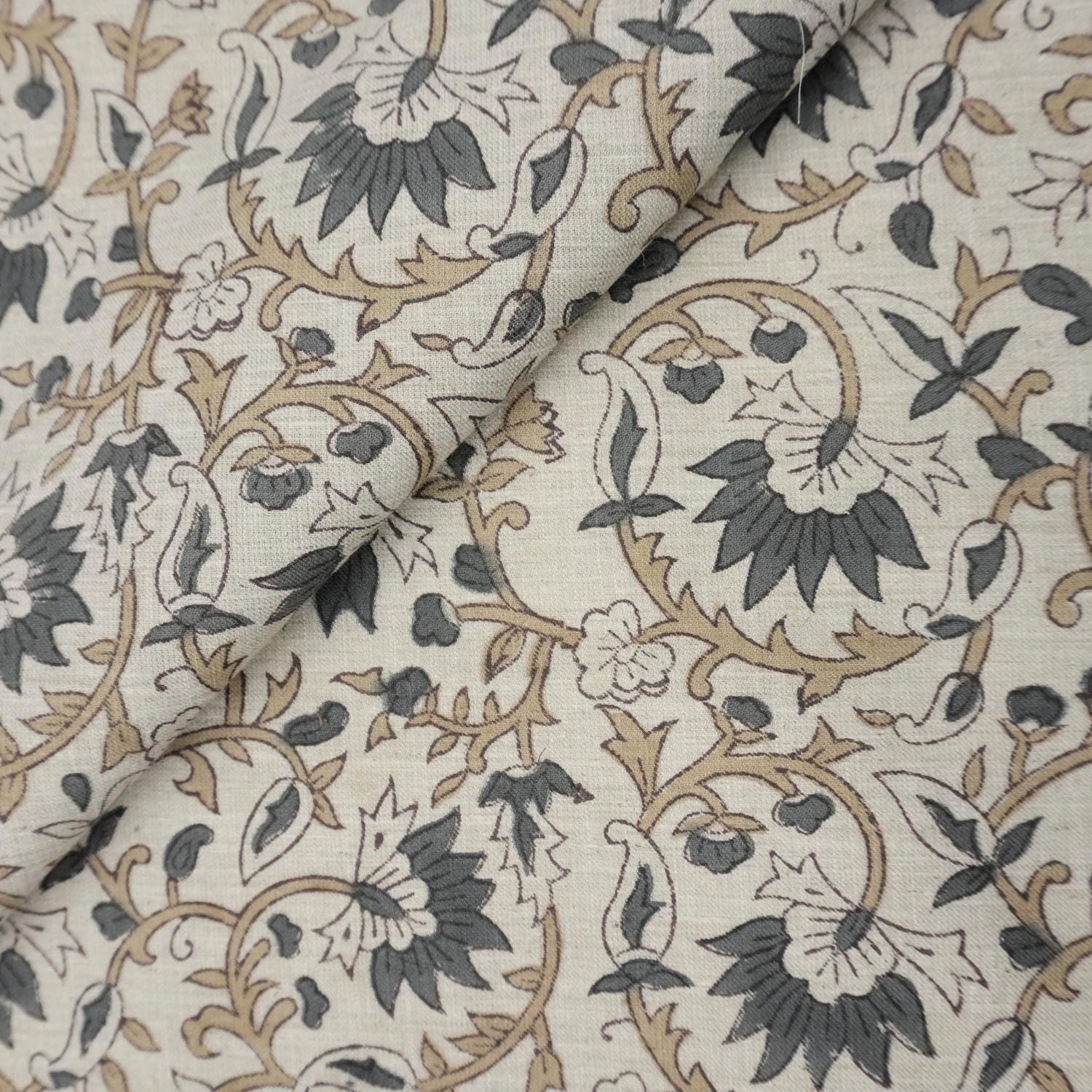Handcrafted Block Print Gray and Pastel Brown Floral Linen Blend Fabric for Cushions & Window Curtains - MADHAV