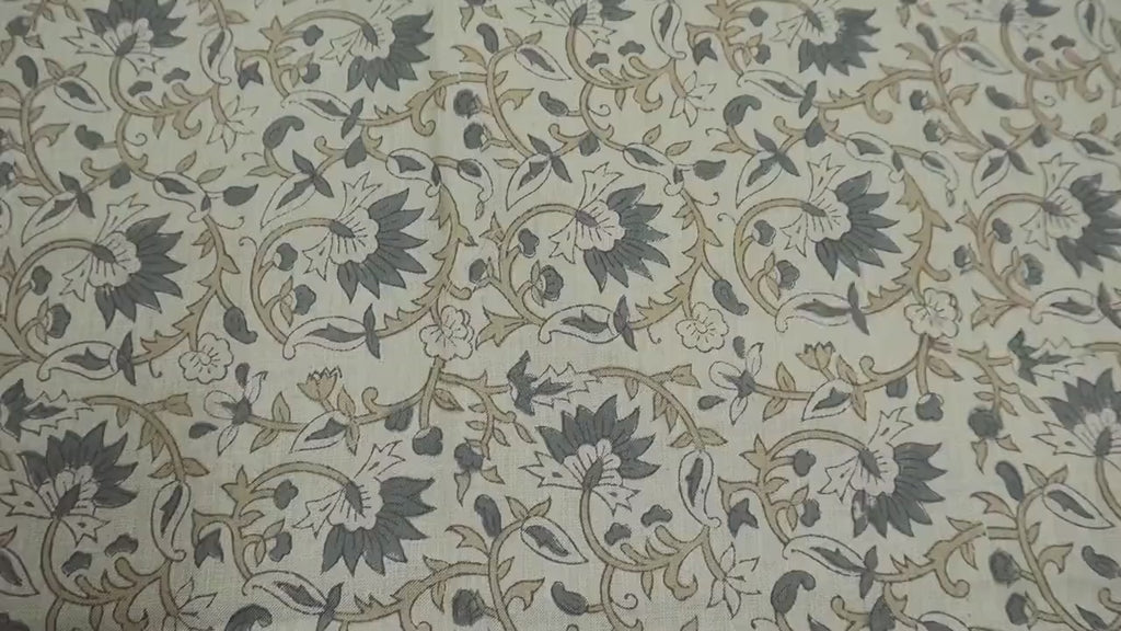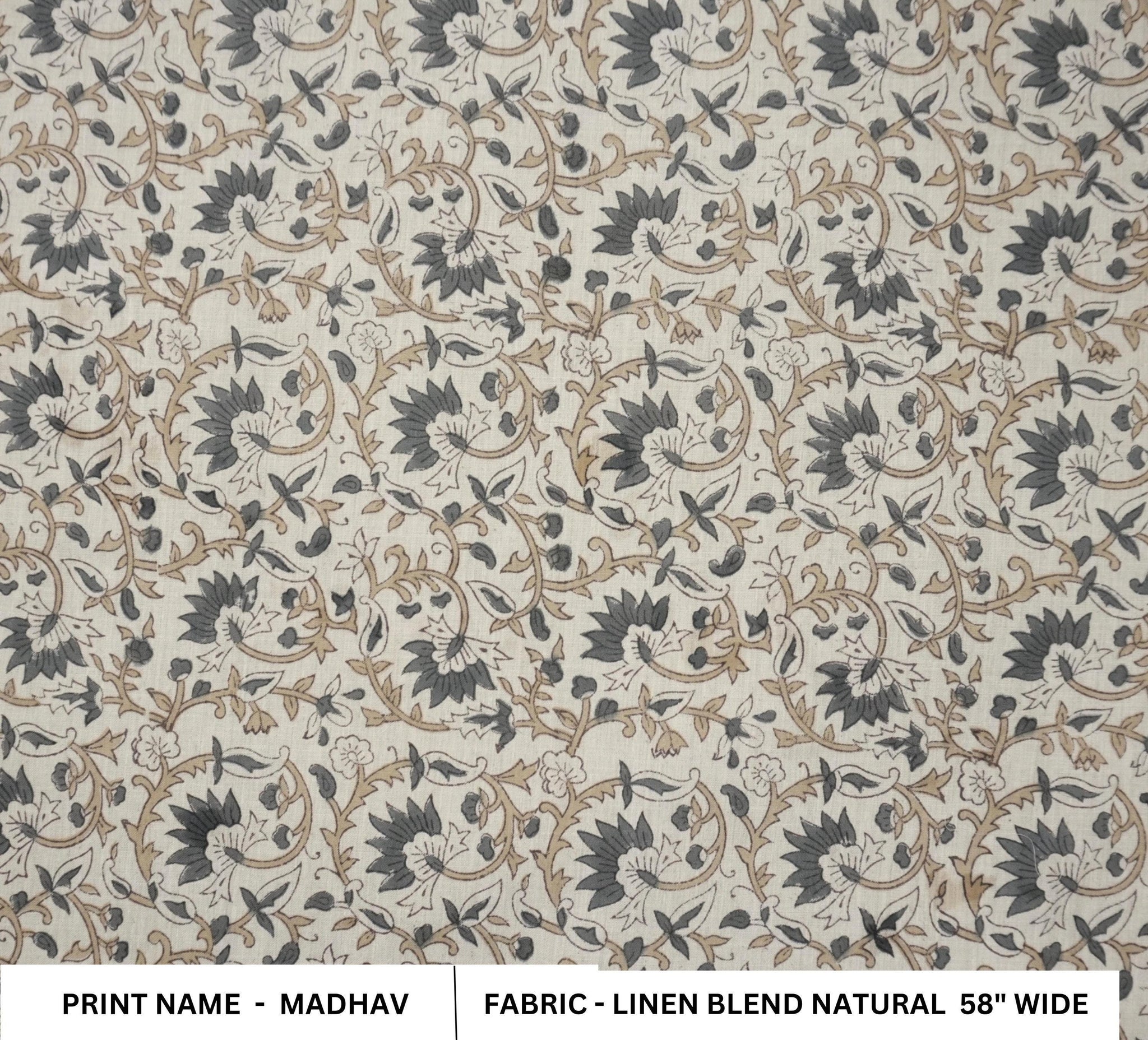 Elevate your home décor with the MADHAV Handcrafted Block Printed Linen Blend Fabric. Featuring a graceful blend of gray and pastel brown floral motifs, this fabric brings understated elegance to any space. Crafted by skilled Indian artisans using traditional block printing techniques, each yard showcases authentic craftsmanship and timeless charm. The linen blend texture offers a perfect balance of softness and durability, making it ideal for cushions, window curtains, table linens, and upholstery projects. Natural variations in print and tone add to its artisanal beauty.