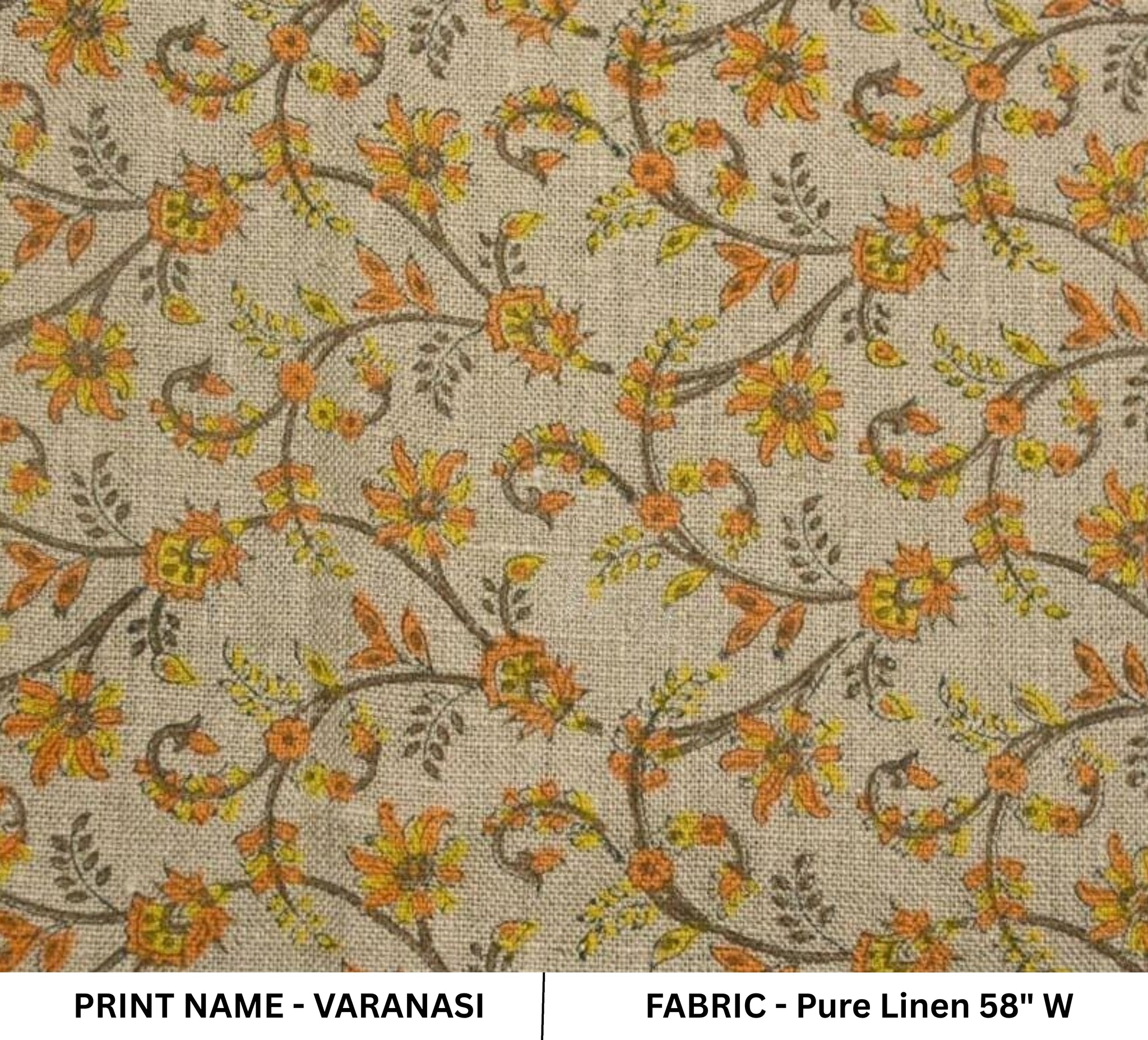 Enhance your living space with the timeless charm of this Handcrafted Block Printed Pure Linen Fabric – Varanasi Orange and Yellow Floral Design. Expertly printed by artisans using traditional wooden blocks, this fabric reflects the rich textile heritage of India. The vibrant floral motif in warm orange and yellow tones adds a touch of elegance, making it perfect for home decor projects such as curtains, cushion covers, table runners, upholstery, and more. Made from 100% pure linen, this fabric is breathable, durable, and beautifully textured for a natural, premium look.