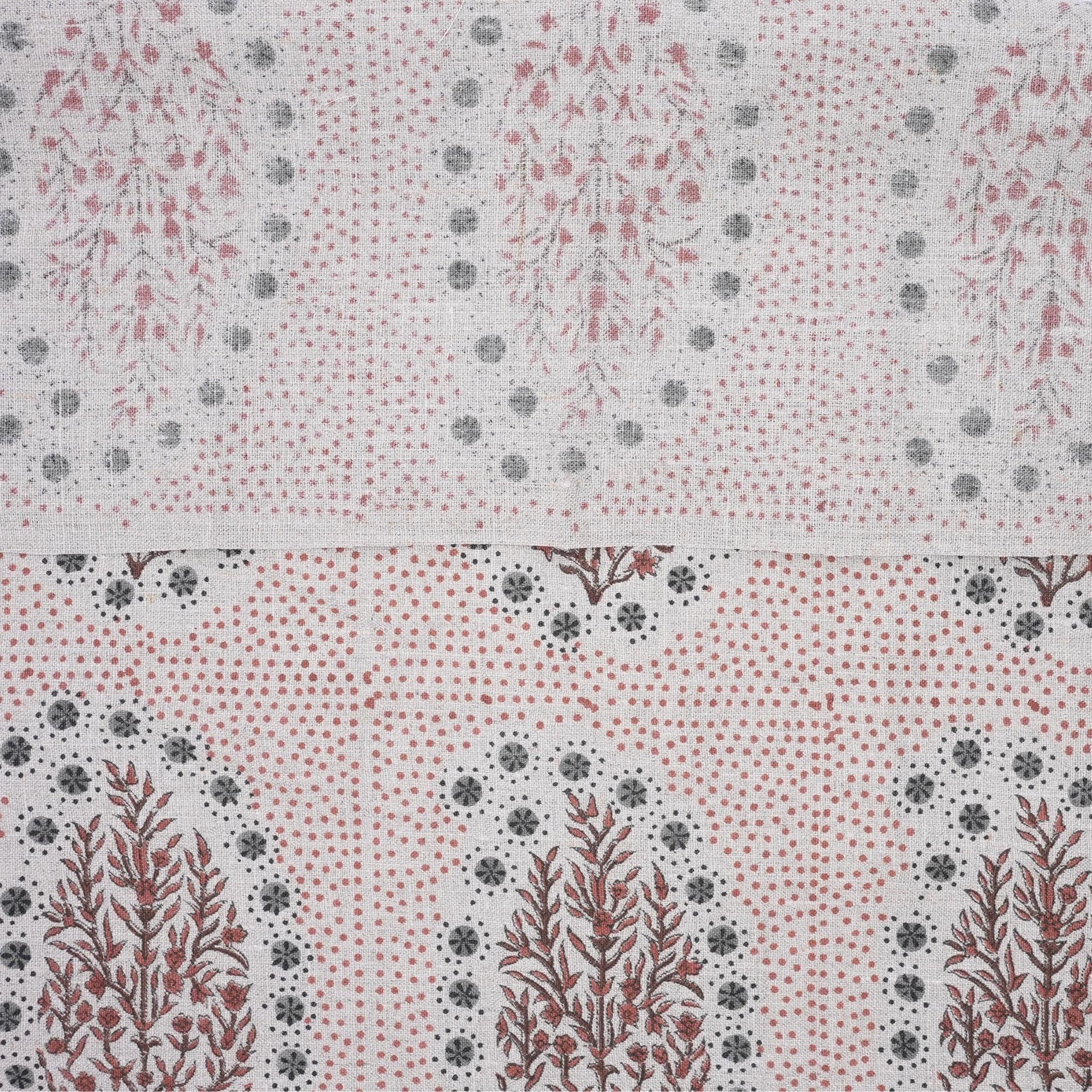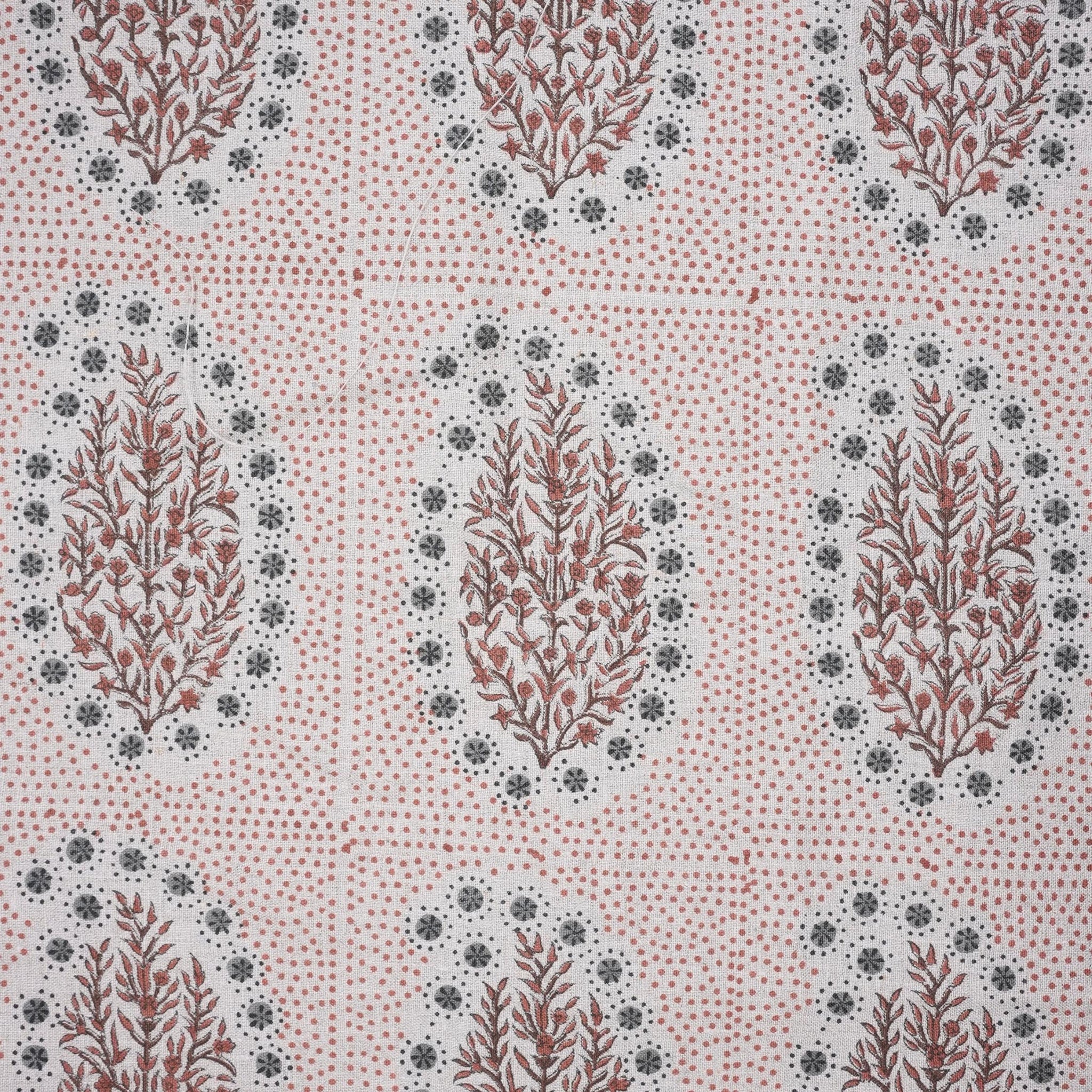 Indian Ancient Block Print Window Curtain Fabric on Natural Linen with Brown and Gray Floral - Vatika Design