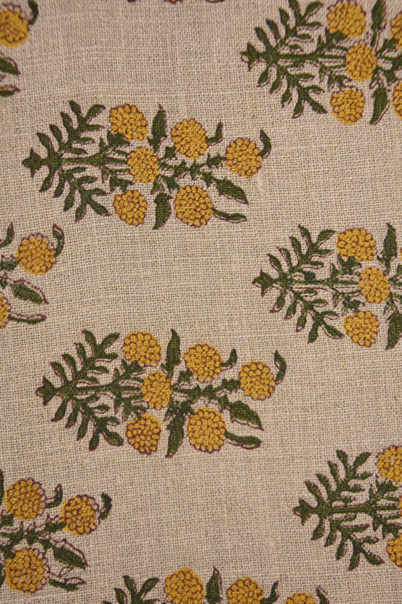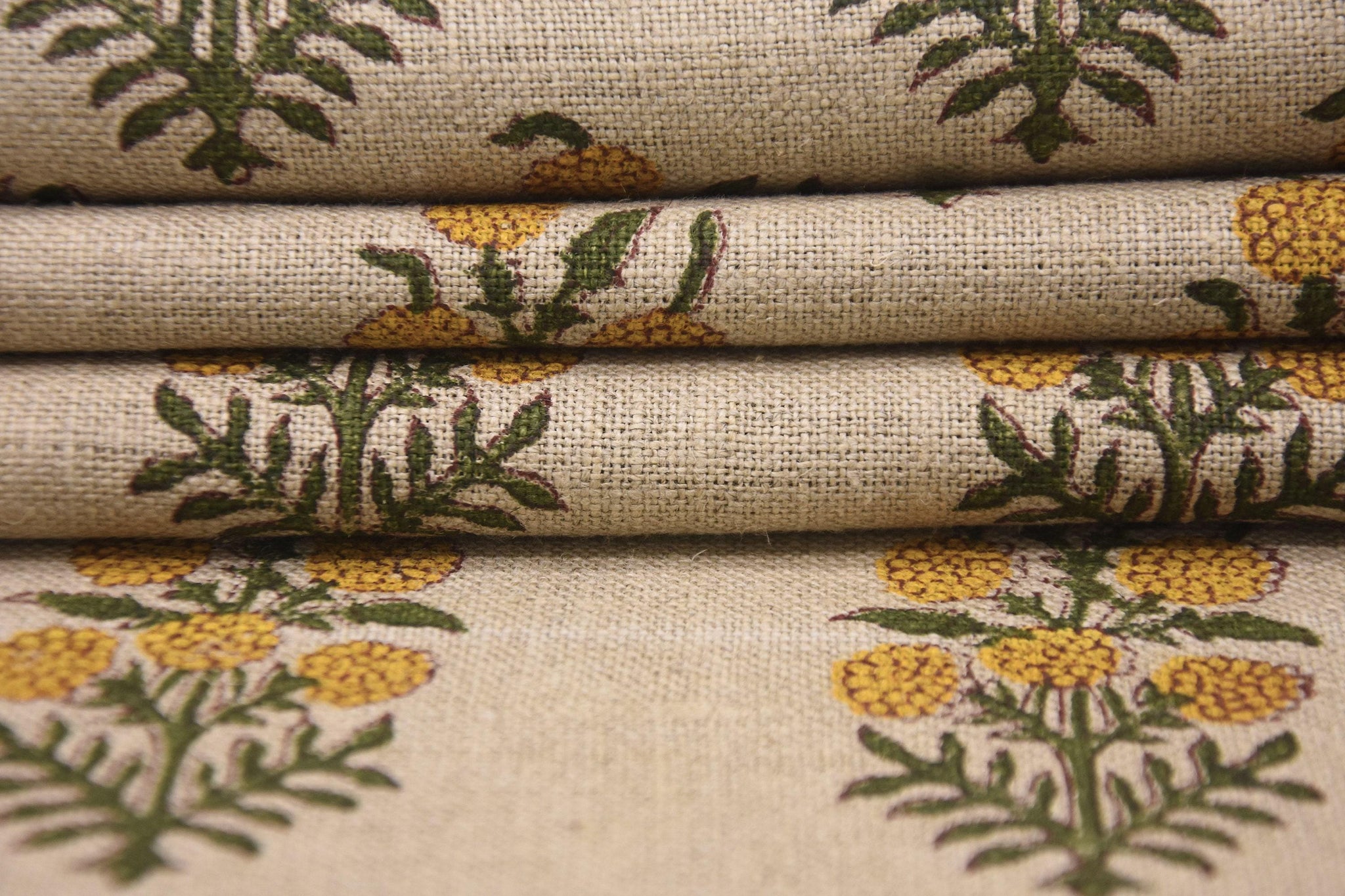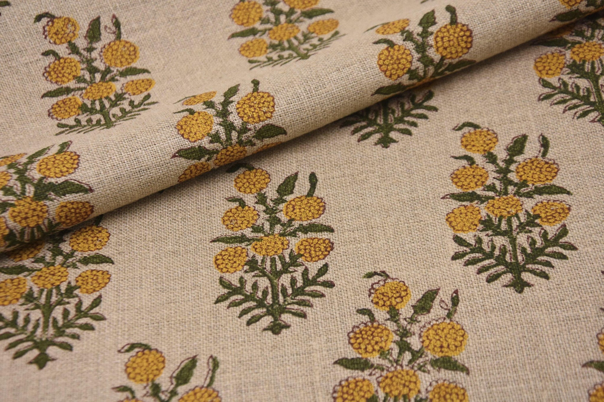 The heavy linen texture provides structure and longevity while maintaining a natural, breathable feel. Its mustard and green floral design blends seamlessly with boho, farmhouse, and modern decor styles, adding warmth and handcrafted charm to any space. Each yard reflects subtle variations in print, showcasing the uniqueness of traditional block printing.