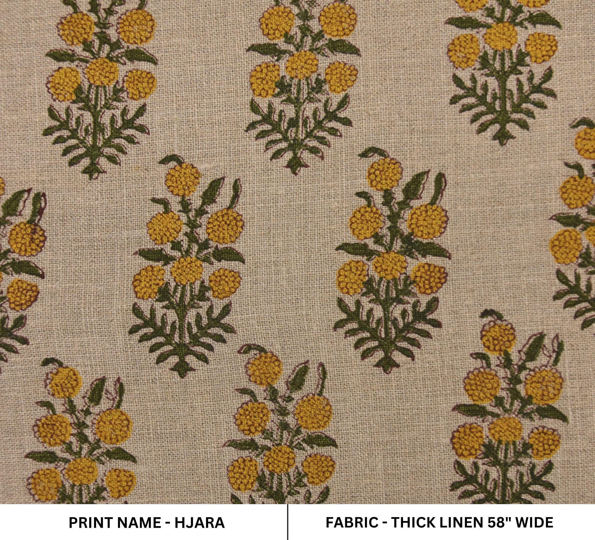 Add artisanal elegance to your interiors with the HJARA Indian Block Printed Heavy Linen Fabric. Featuring vibrant mustard and green floral motifs, this fabric is hand block printed by skilled Indian artisans using traditional techniques. Made from thick, durable linen, it is perfect for window curtains, cushions, pillow covers, upholstery, and other decorative home projects.