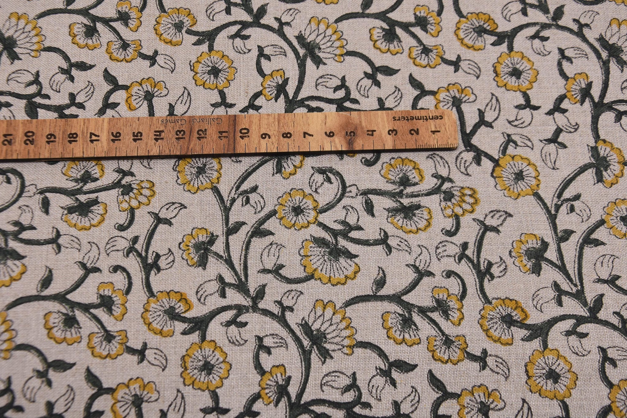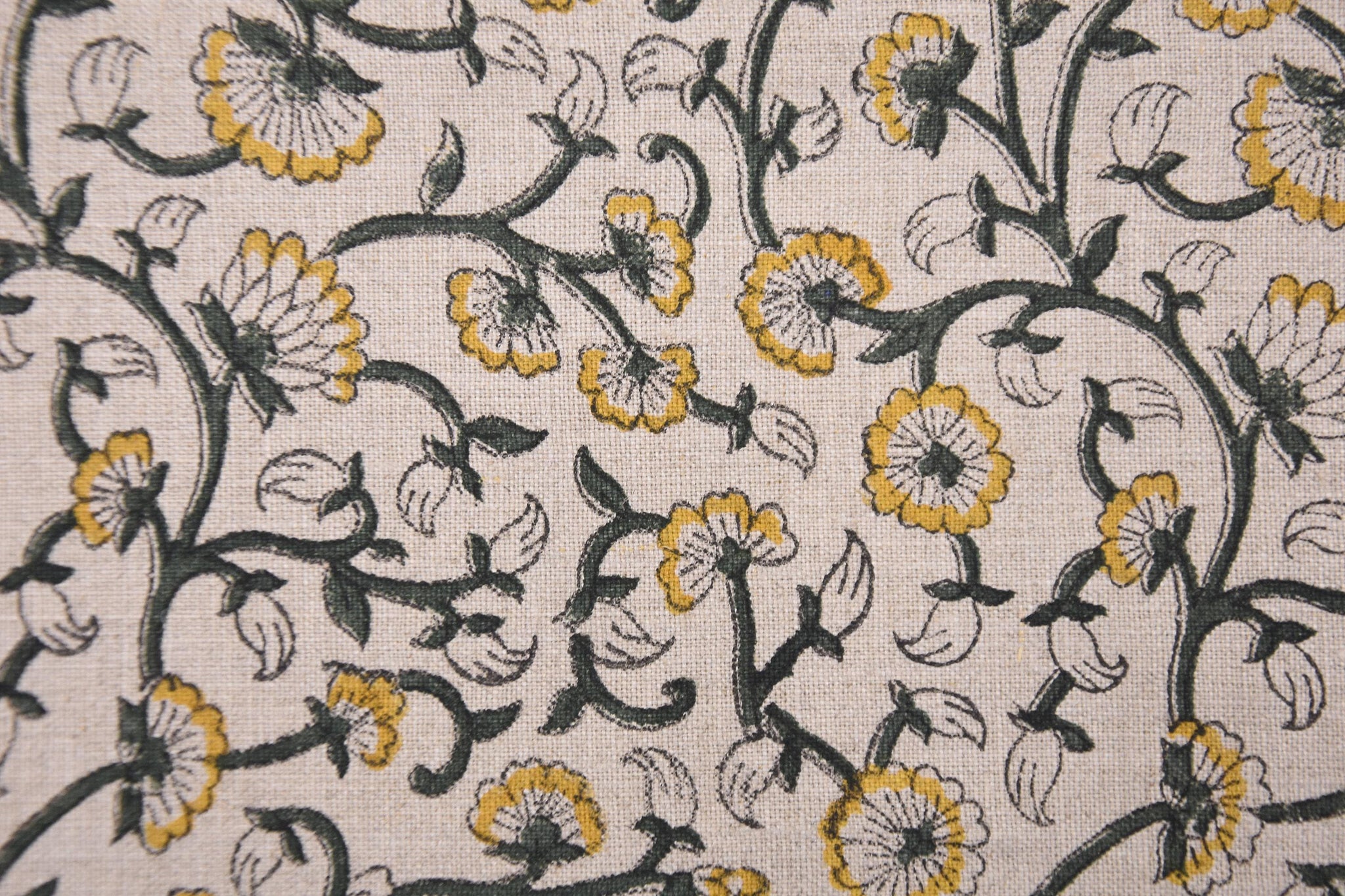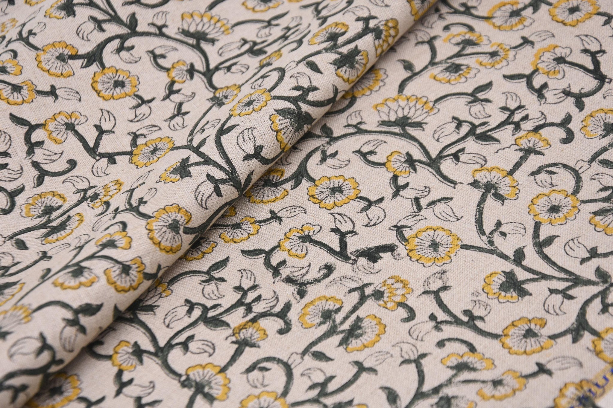 Handmade Indian Block Printed Elegant Pure Linen in Mustard and Gray Floral Base Fabric – Himachal