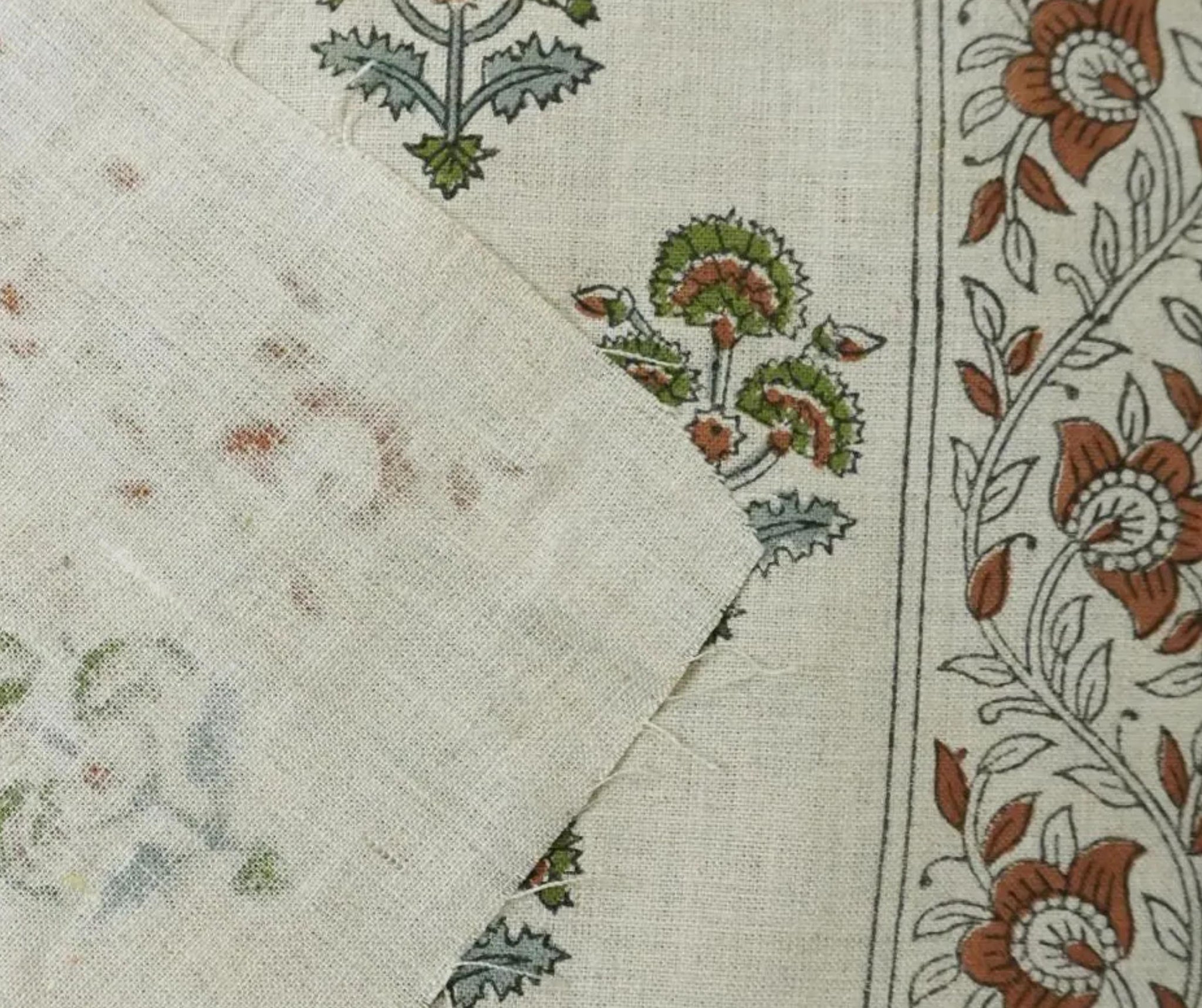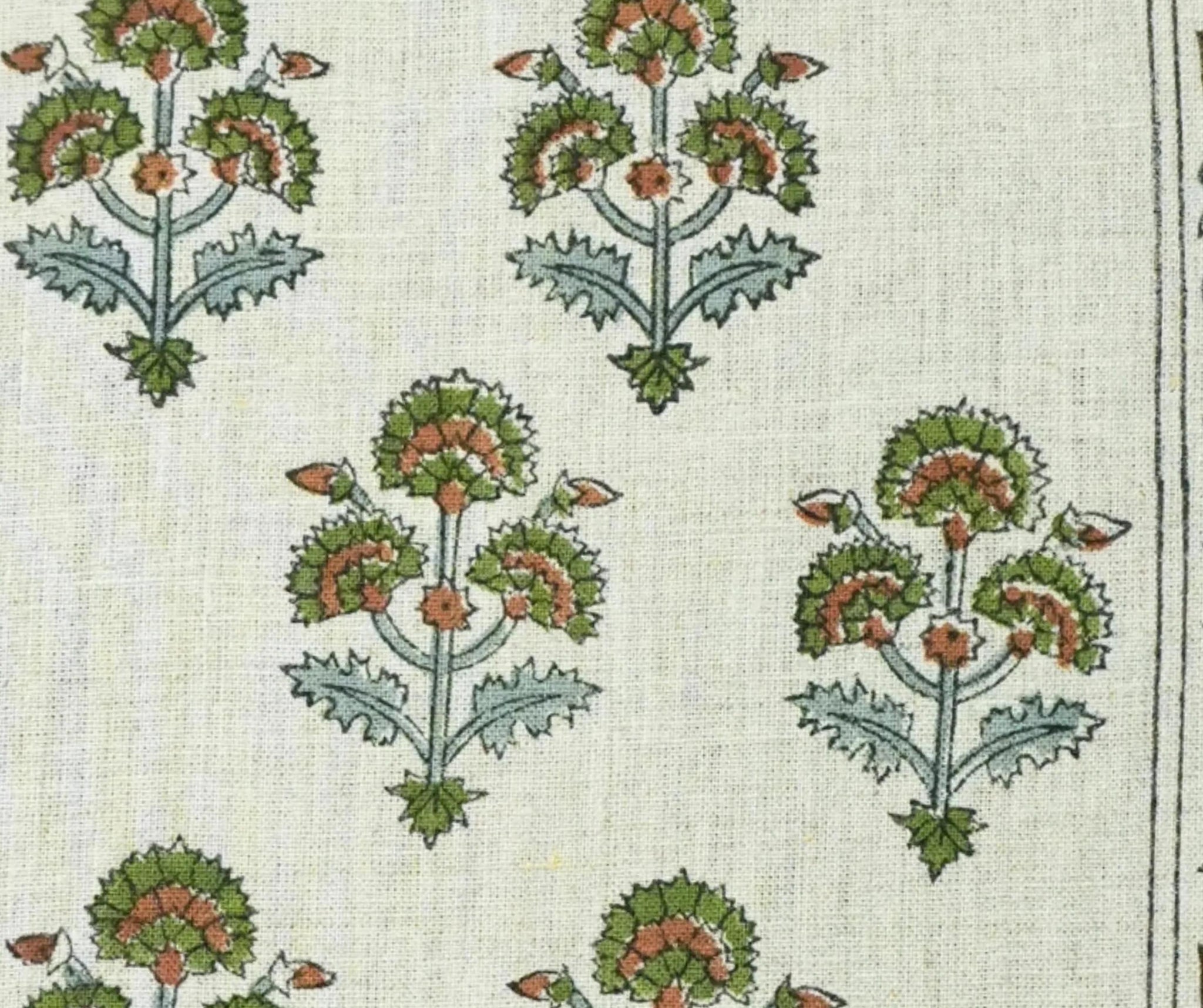 Block Printed Pure Linen Fabric with Green, Gray and Bronze Floral Indian Art in Medium Weight Curtain Textile – TRAFFIC LIGHT BORDER