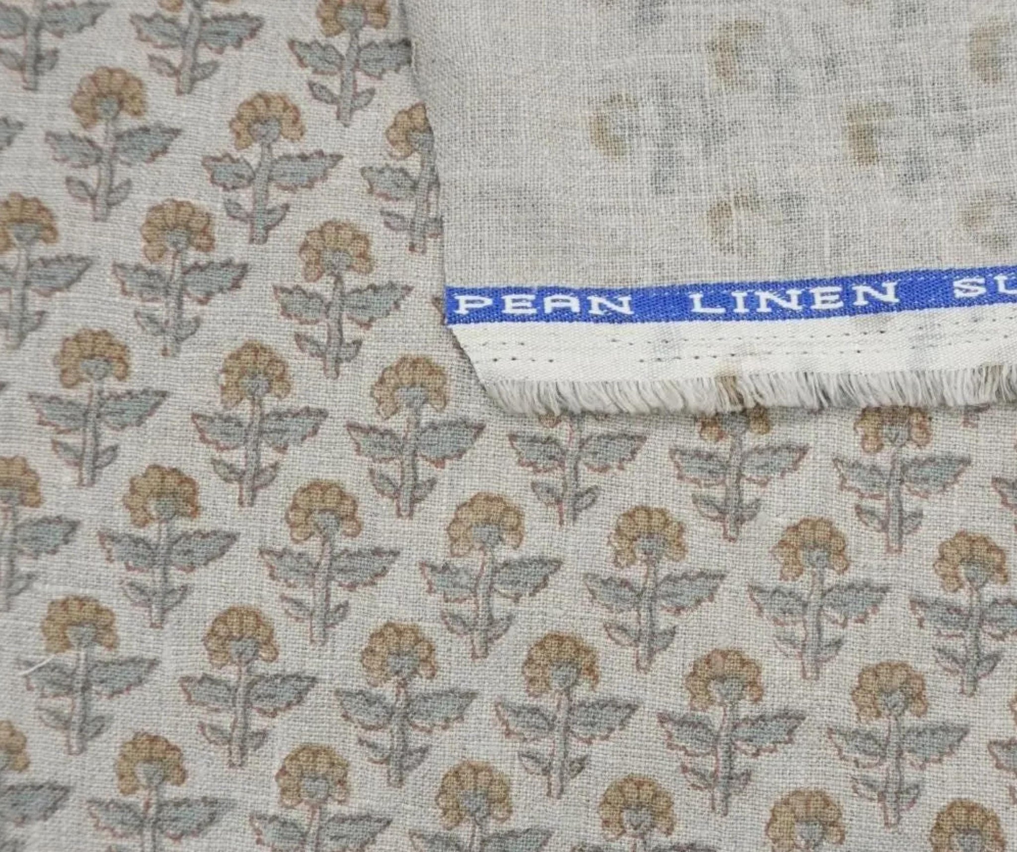 • Gray and sage green floral motifs on pure linen