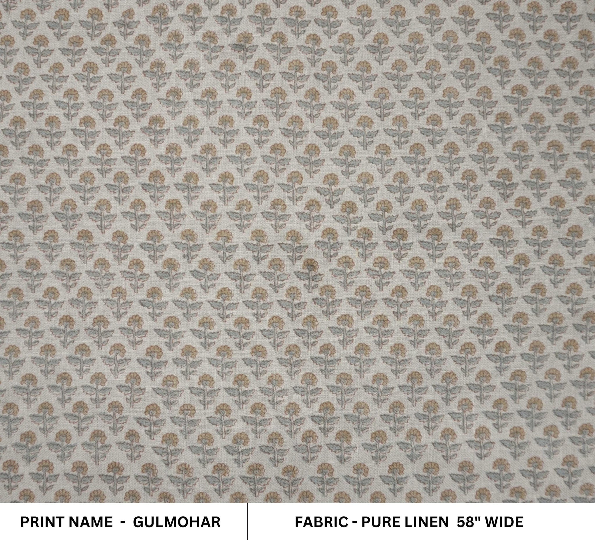 Bring timeless elegance to your space with the GULMOHAR Hand Block Printed Pure Linen Fabric. Showcasing delicate gray and sage green floral motifs, this artisanal fabric is crafted using traditional Indian block printing techniques. Its soft yet durable texture makes it ideal for creating table napkins, decorative tablecloths, valances, or elegant upholstery. The breathable pure linen ensures comfort and a refined natural look, perfect for enhancing any home interior with handcrafted sophistication.
