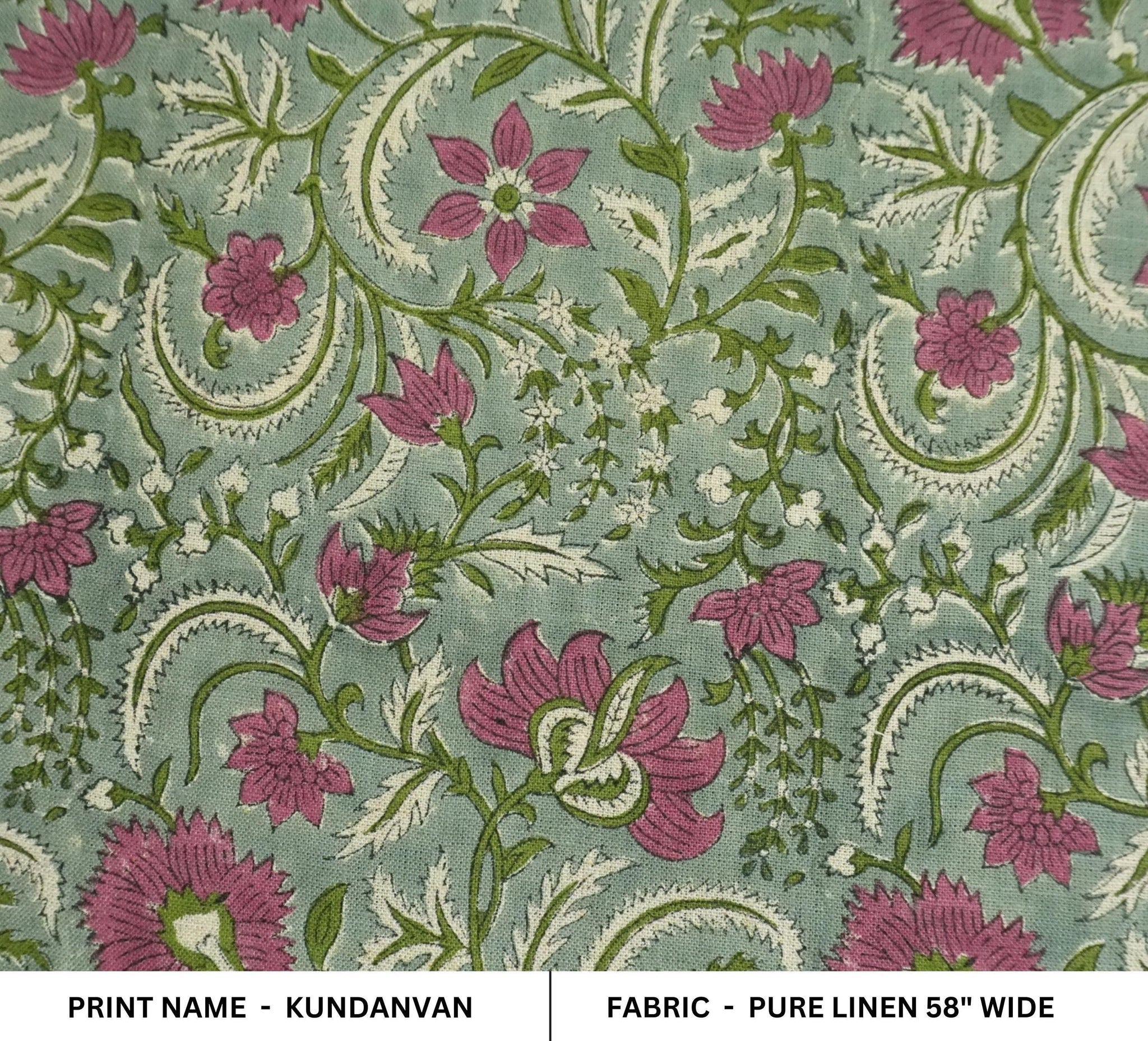 Handcrafted Green and Rose Gold Floral Pure Linen Block Printed Fabric for Sofa Covers – KUNDANVAN