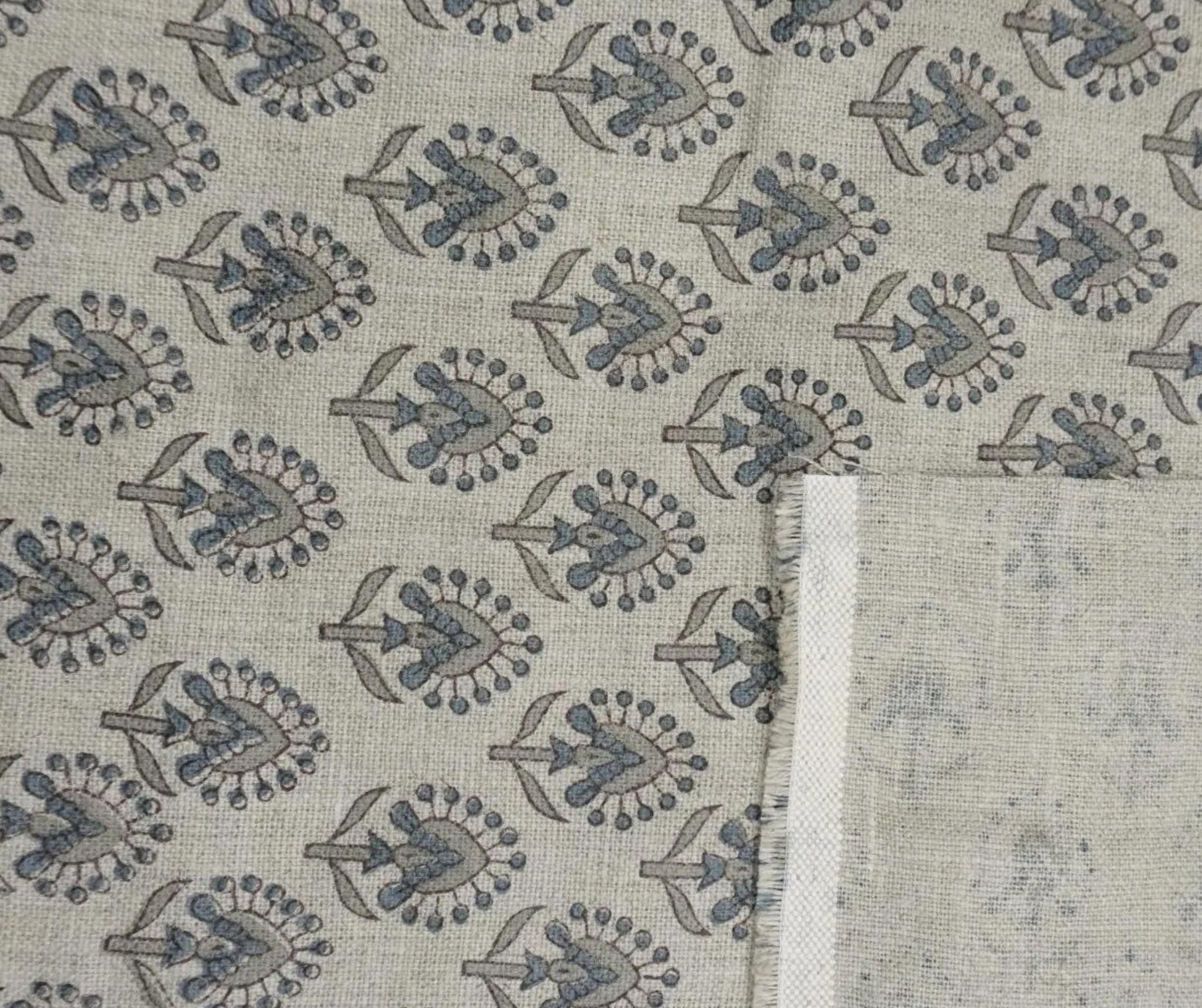 Thick Linen Heavyweight Gray Floral Indian Block Printed Fabric for Cushions, Upholstery & Home Decor - GURUKUL