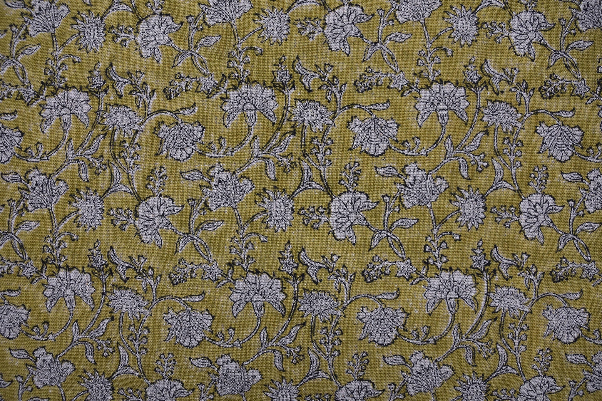 Thick Linen Handmade Indian Block Printed 58" Wide Fabric In Green and Gray Floral for Decorative Cushion Covers – Naayab