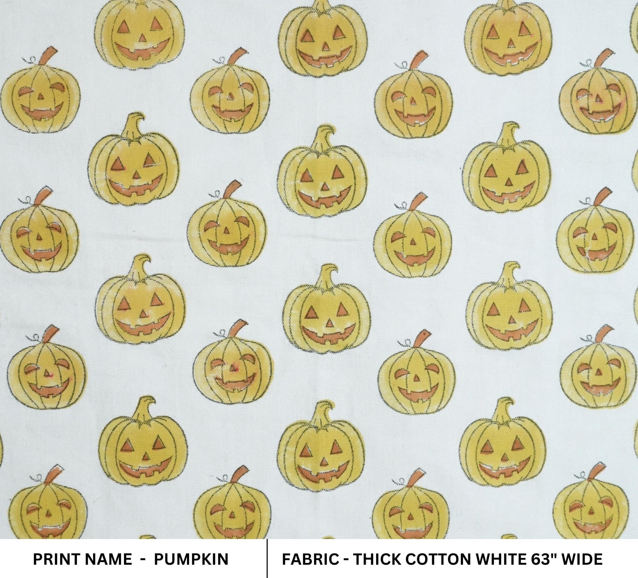 Celebrate the festive season with PUMPKIN – Yellow & Brown Ghost Pumpkin Print Thick Cotton White Fabric. Crafted from durable, medium-weight cotton, this handmade fabric is perfect for creating festive décor, tablecloths, cushion covers, curtains, or other decorative home accents.